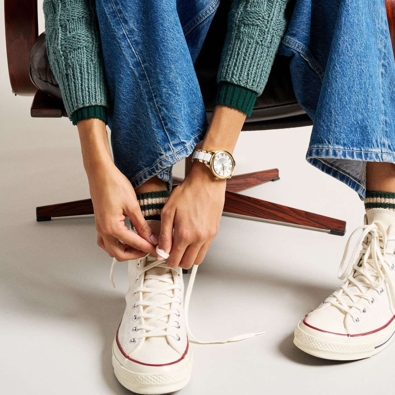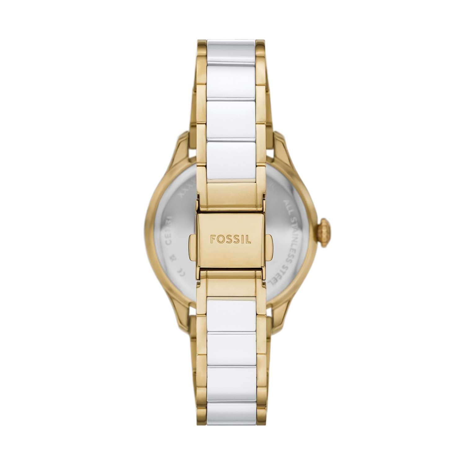 Женские кварцевые часы Fossil — это элегантный аксессуар, сочетающий стиль и надежность. Модель CE1131 выполнена в круглом корпусе диаметром 38 мм из нержавеющей стали с IP-покрытиемIP-покрытиеМетод ионного напыления. Демонстрирует повышенную устойчивость к истиранию, окислению и химическим веществам. Под воздействием высокого давления и температуры около 1500°C молекулы металла надёжно соединяются с частицами корпуса часов. цвета жёлтого золота. Циферблат белого цвета оформлен индексами и стрелками. Окошко даты расположено в положении 6 часов. Циферблат защищён минеральным стекломМинеральное стеклоМинеральное стекло представляет собой искусственно выращенный минерал кварца. Такое стекло отличается особой устойчивостью к повреждениям и царапинам. Уступает по некоторым качествам сапфировому стеклу.. Часы оснащены браслетом из керамики и стали с IP-покрытиемIP-покрытиеМетод ионного напыления. Демонстрирует повышенную устойчивость к истиранию, окислению и химическим веществам. Под воздействием высокого давления и температуры около 1500°C молекулы металла надёжно соединяются с частицами корпуса часов. на застёжке «бабочка» с кнопкамиЗастёжка "бабочка"Такой вид застёжки дополняется предохранителями, помогающими избежать случайного раскрытия браслета. Обладают изящным исполнением. . Водонепроницаемость 50 м позволяет использовать часы для плавания и повседневного ношения. Идеальный выбор для тех, кто ценит американское качество и безупречный дизайн.