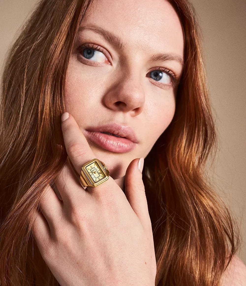 Уникальные часы-кольцо с минеральным стекломМинеральное стеклоМинеральное стекло представляет собой искусственно выращенный минерал кварца. Такое стекло отличается особой устойчивостью к повреждениям и царапинам. Уступает по некоторым качествам сапфировому стеклу. Fossil Raquel Ring ES5343, кварцевый механизм с высокой точностью. Корпус и браслет часов изготовлены из нержавеющей стали с IP-покрытиемIP-покрытиеМетод ионного напыления. Демонстрирует повышенную устойчивость к истиранию, окислению и химическим веществам. Под воздействием высокого давления и температуры около 1500°C молекулы металла надёжно соединяются с частицами корпуса часов.. Класс водозащиты: 50 метров, позволит защитить корпус от случайных брызг или капель дождя. Циферблат выполнен с метками в виде штрихов. С помощью расширительного ремешка Вы сможете надеть модель на любой палец.