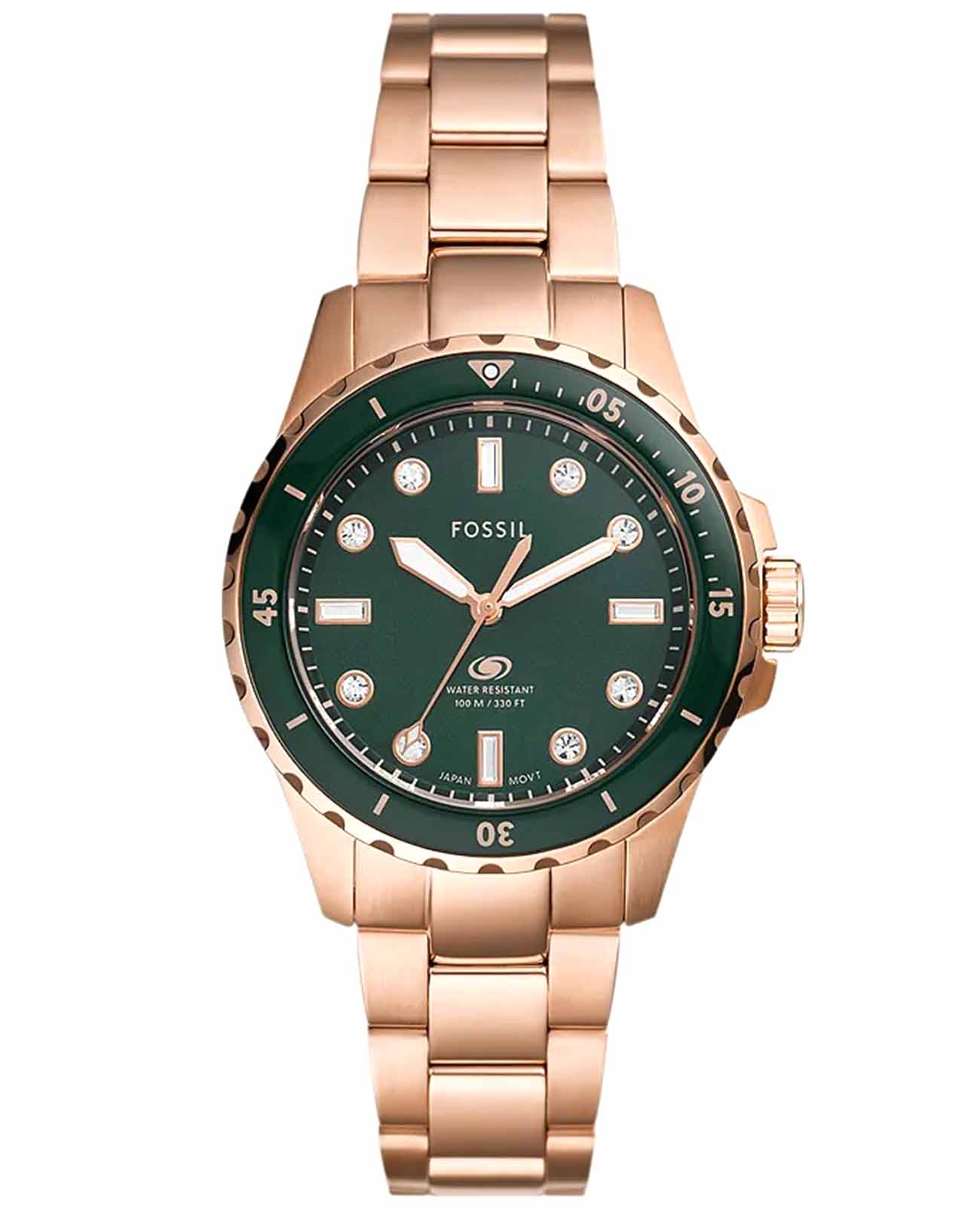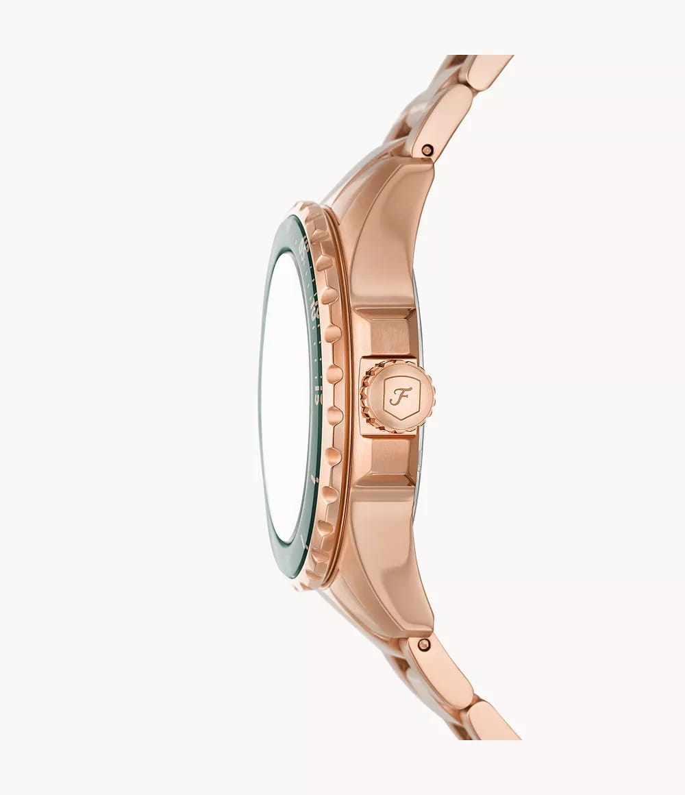 Женские часы Fossil Blue Dive ES5371 — это изящный и практичный аксессуар, который станет идеальным дополнением как для повседневных, так и для вечерних образов. Модель сочетает в себе элегантный дизайн и высокое качество, что делает её универсальным выбором для любой ситуации. Часы оснащены кварцевым механизмом, обеспечивающим точность и надёжность хода. Корпус и браслет выполнен из стали с розово-золотистым IP-покрытиемIP-покрытиеМетод ионного напыления. Демонстрирует повышенную устойчивость к истиранию, окислению и химическим веществам. Под воздействием высокого давления и температуры около 1500°C молекулы металла надёжно соединяются с частицами корпуса часов., что гарантирует долговечность и современный вид. А на вращающийся в одном направлении безельБезельВнешний ободок, закрепляющий стекло. В спортивных часах так называется поворотное кольцо с делениями на циферблате, выполняет роль таймера – замеряет отрезки времени на шкале. Неподвижный безель – элемент декора. Однонаправленно вращающийся безель на дайверских часах позволяет фиксировать моменты погружения и выныривания на поверхность. нанесено зеленое IP-покрытиемIP-покрытиеМетод ионного напыления. Демонстрирует повышенную устойчивость к истиранию, окислению и химическим веществам. Под воздействием высокого давления и температуры около 1500°C молекулы металла надёжно соединяются с частицами корпуса часов.. Минеральное стеклоМинеральное стеклоМинеральное стекло представляет собой искусственно выращенный минерал кварца. Такое стекло отличается особой устойчивостью к повреждениям и царапинам. Уступает по некоторым качествам сапфировому стеклу. защищает циферблат от царапин и механических повреждений, а рифленая заводная головка и браслет с раскладной застёжкойРаскладная застёжкаТакой тип застёжки используется только на браслетах из металла. Она никогда не раскрывается полностью, происходит разделение на 2 и более частей. Раскладывающая застёжка снизит вероятность потери часов к минимуму. обеспечивают удобство и комфорт в ношении. Стрелки с люминесцентным покрытиемЛюминесцентное покрытиеПозволяет считывать показания времени в темноте. Производители наносят на стрелки, часовые индексы, безель или поверхность циферблата светонакопительный состав, дающий холодное свечение. позволяют легко считывать время даже в условиях низкой освещенности, а метки в виде штрихов и точек, инкрустированных кристаллами. Водозащита до 10 бар (100 метров) позволяет не только принимать душ, но и плавать, не снимая часы. Зеленый циферблат придает часам свежий и стильный вид. Международная гарантия от производителя на 24 месяца дает уверенность в качестве и надежности часов.