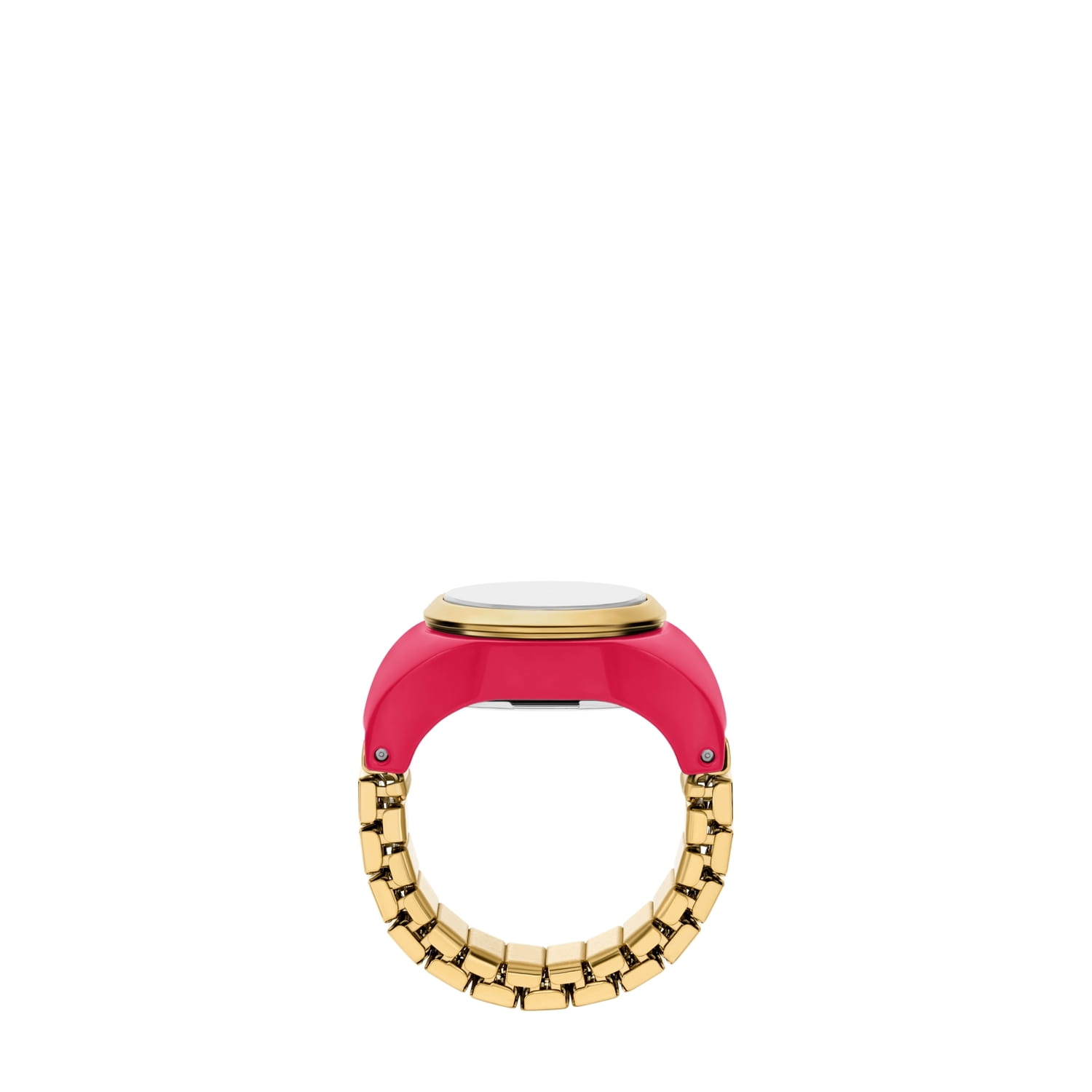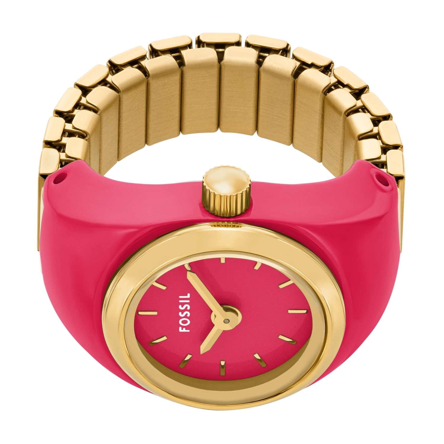 Женские кварцевые часы-кольцо Fossil — это изысканный и универсальный аксессуар, сочетающий модный дизайн и функциональность. Модель ES5414 выполнена в виде кольца с круглым корпусом диаметром 15 мм из нержавеющей стали с покрытием цвета жёлтого золота и глянцевым розовым керамическим напылением. Циферблат розового цвета оформлен двумя стрелками без индикации даты. Циферблат защищён минеральным стекломМинеральное стеклоМинеральное стекло представляет собой искусственно выращенный минерал кварца. Такое стекло отличается особой устойчивостью к повреждениям и царапинам. Уступает по некоторым качествам сапфировому стеклу.. Часы оснащены расширяемым браслетом (expansion band) из стали с IP-покрытиемIP-покрытиеМетод ионного напыления. Демонстрирует повышенную устойчивость к истиранию, окислению и химическим веществам. Под воздействием высокого давления и температуры около 1500°C молекулы металла надёжно соединяются с частицами корпуса часов. цвета жёлтого золота, не имеющим застёжки, что обеспечивает удобную посадку на пальце (размер кольца 6,5–8). Водонепроницаемость 50 м позволяет использовать часы в повседневных условиях. Идеальный выбор для тех, кто ценит стиль и американское качество.