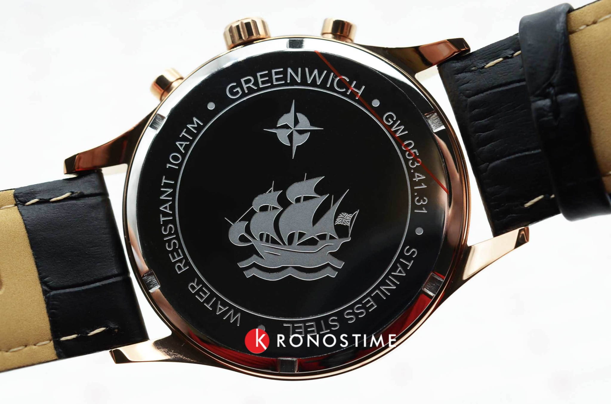 Мужские английские часы c хронографомХронографФункция позволяет измерять отрезки времени с особой точностью: часы, минуты, секунды. Верным признаком хронографа является наличие на циферблате 3 дополнительных окошек-счётчиков. Greenwich Navigator GW 053.41.31, кварцевый механизм с высокой точностью. Класс водозащиты: 100 метров, позволит плавать, нырять и заниматься другими водными видами спорта. Корпус часов изготовлен из стали с PVD-покрытиемPVDУльтратонкое покрытие наносится в технике вакуумного напыления, сочетает в себе нитрид титана особой прочности со слоем золота или оксида хрома. Несёт в себе декоративную или защитную функцию.. Минеральное стеклоМинеральное стеклоМинеральное стекло представляет собой искусственно выращенный минерал кварца. Такое стекло отличается особой устойчивостью к повреждениям и царапинам. Уступает по некоторым качествам сапфировому стеклу. устойчивое к мелким механическим повреждениям. Стрелки и метки с люминесцентным покрытиемЛюминесцентное покрытиеПозволяет считывать показания времени в темноте. Производители наносят на стрелки, часовые индексы, безель или поверхность циферблата светонакопительный состав, дающий холодное свечение.. Кожаный ремешок на стандартной застёжке. СекундомерСекундомерСекундоме́р — прибор, способный измерять интервалы времени с точностью до долей секунды.. Окошко даты находится в положении между 4 и 5 часов.