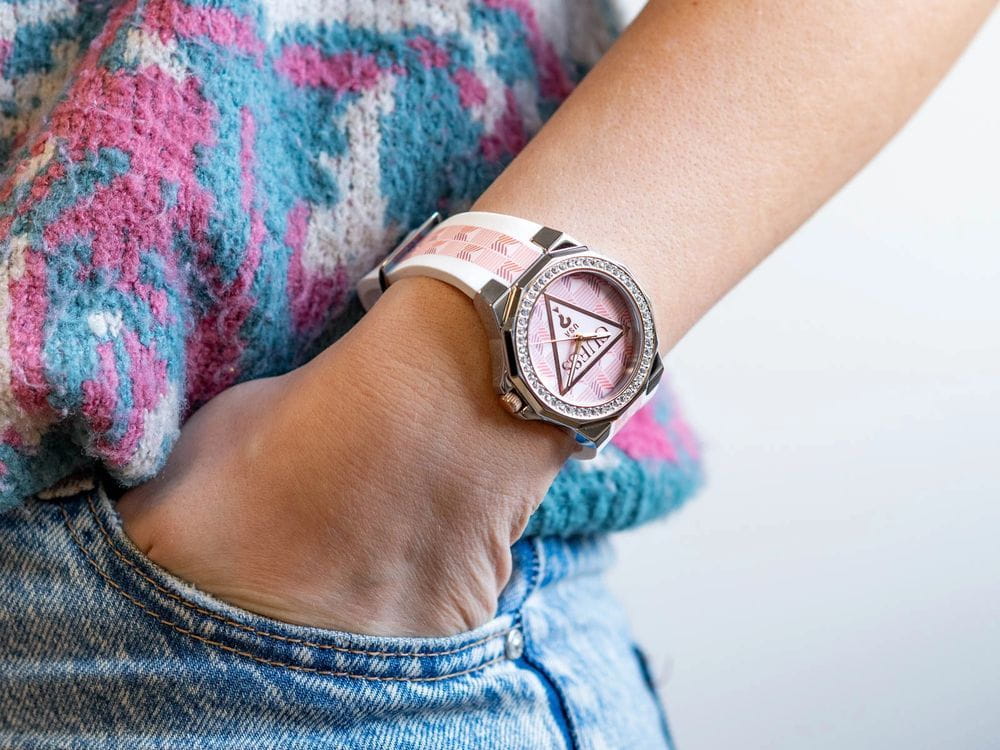 Guess GW0834L2 — женственные часы, в которых элегантность сочетается с фирменным блеском бренда. Корпус диаметром 38 мм выполнен из нержавеющей стали и украшен россыпью кристаллов по безелю, а циферблат с геометрическим узором и крупным логотипом Guess придаёт модели выразительность и модный акцент. За надёжную работу отвечает кварцевый механизм, защищённый минеральным стекломМинеральное стеклоМинеральное стекло представляет собой искусственно выращенный минерал кварца. Такое стекло отличается особой устойчивостью к повреждениям и царапинам. Уступает по некоторым качествам сапфировому стеклу., устойчивым к мелким повреждениям. Силиконовый ремешок в серебристо-розовом тоне на стандартной застежке, обеспечивающую удобную посадку на запястье. Водозащита 30м защищает часы от случайных брызг. Guess— утончённый аксессуар, объединяющий изящество ювелирного дизайна и современный стиль.