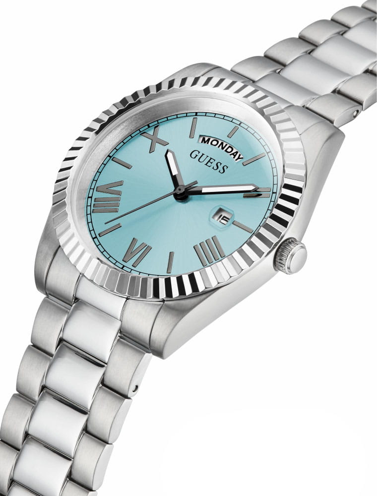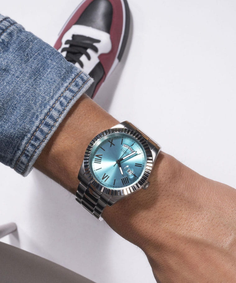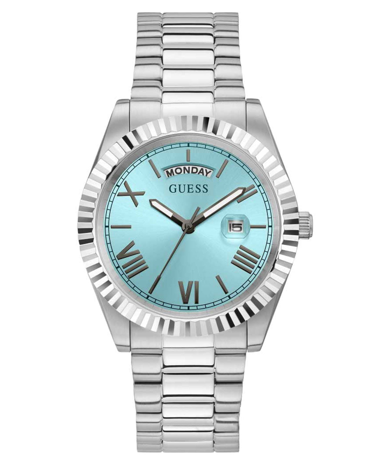 Мужские наручные часы в стиле fashion Guess GW0265G11 с минеральным стекломМинеральное стеклоМинеральное стекло представляет собой искусственно выращенный минерал кварца. Такое стекло отличается особой устойчивостью к повреждениям и царапинам. Уступает по некоторым качествам сапфировому стеклу., кварцевый механизм с высокой точностью. Класс водозащиты: 50 метров, позволит защитить корпус от случайных брызг или капель дождя. Корпус часов изготовлен из стали. Циферблат выполнен по технологии Sunray (солнечные лучи). Метки в виде штрихов и римских цифр. Окошко даты с увеличительным стеклом. День недели отображается в положении 12 часов. Браслет с раскладной застёжкойРаскладная застёжкаТакой тип застёжки используется только на браслетах из металла. Она никогда не раскрывается полностью, происходит разделение на 2 и более частей. Раскладывающая застёжка снизит вероятность потери часов к минимуму.