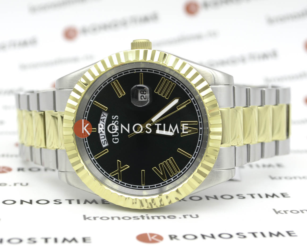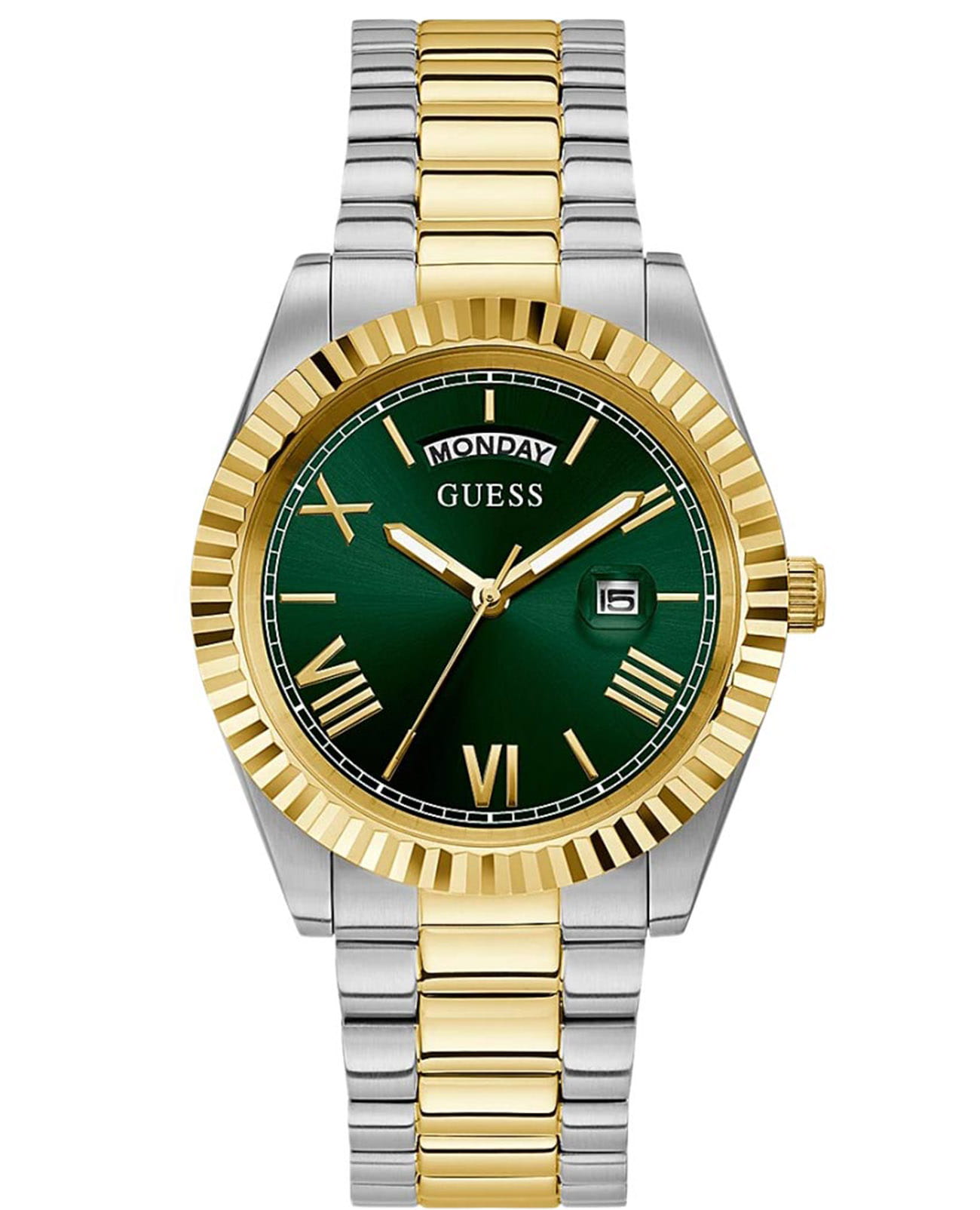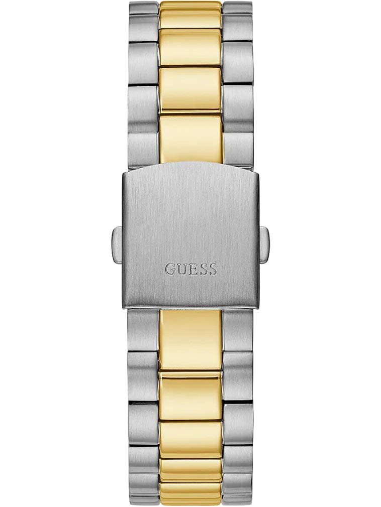 Мужские наручные часы в стиле fashion Guess GW0265G8 с минеральным стекломМинеральное стеклоМинеральное стекло представляет собой искусственно выращенный минерал кварца. Такое стекло отличается особой устойчивостью к повреждениям и царапинам. Уступает по некоторым качествам сапфировому стеклу., кварцевый механизм с высокой точностью. Класс водозащиты: 50 метров, позволит защитить корпус от случайных брызг или капель дождя. Корпус часов изготовлен из стали с IP-покрытиемIP-покрытиеМетод ионного напыления. Демонстрирует повышенную устойчивость к истиранию, окислению и химическим веществам. Под воздействием высокого давления и температуры около 1500°C молекулы металла надёжно соединяются с частицами корпуса часов.. Циферблат выполнен по технологии Sunray (солнечные лучи). Метки в виде штрихов и римских цифр. Окошко даты с увеличительным стеклом. День недели отображается в положении 12 часов. Браслет с раскладной застёжкойРаскладная застёжкаТакой тип застёжки используется только на браслетах из металла. Она никогда не раскрывается полностью, происходит разделение на 2 и более частей. Раскладывающая застёжка снизит вероятность потери часов к минимуму.