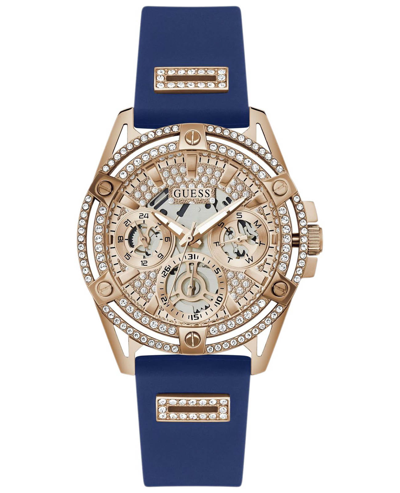 Женские наручные часы-скелетоны с минеральным стекломМинеральное стеклоМинеральное стекло представляет собой искусственно выращенный минерал кварца. Такое стекло отличается особой устойчивостью к повреждениям и царапинам. Уступает по некоторым качествам сапфировому стеклу. Guess Queen GW0536L5, кварцевый механизм с высокой точностью. Класс водозащиты: 30 метров, позволит защитить корпус от случайных брызг или капель дождя. Корпус часов изготовлен из стали с IP-покрытиемIP-покрытиеМетод ионного напыления. Демонстрирует повышенную устойчивость к истиранию, окислению и химическим веществам. Под воздействием высокого давления и температуры около 1500°C молекулы металла надёжно соединяются с частицами корпуса часов.. Силиконовый ремешок на стандартной застёжке. 24-х часовой формат времени, дата и день недели вынесены на отдельные циферблаты. Метки в виде штрихов. Рифленая заводная головка с защитой. Циферблат и ремешок украшены кристаллами.