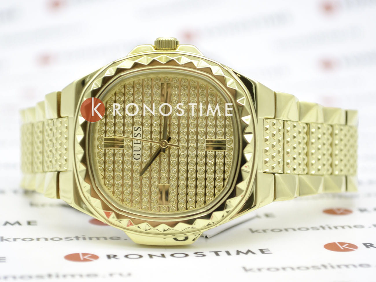 Женские наручные часы с минеральным стекломМинеральное стеклоМинеральное стекло представляет собой искусственно выращенный минерал кварца. Такое стекло отличается особой устойчивостью к повреждениям и царапинам. Уступает по некоторым качествам сапфировому стеклу. Guess Lady Idol GW0601L1, кварцевый механизм с высокой точностью. Класс водозащиты: 30 метров, позволит защитить корпус от случайных брызг или капель дождя. Корпус часов изготовлен из стали с IP-покрытиемIP-покрытиеМетод ионного напыления. Демонстрирует повышенную устойчивость к истиранию, окислению и химическим веществам. Под воздействием высокого давления и температуры около 1500°C молекулы металла надёжно соединяются с частицами корпуса часов.. Стальной браслет на раскладной застёжкеРаскладная застёжкаТакой тип застёжки используется только на браслетах из металла. Она никогда не раскрывается полностью, происходит разделение на 2 и более частей. Раскладывающая застёжка снизит вероятность потери часов к минимуму. с IP-покрытиемIP-покрытиеМетод ионного напыления. Демонстрирует повышенную устойчивость к истиранию, окислению и химическим веществам. Под воздействием высокого давления и температуры около 1500°C молекулы металла надёжно соединяются с частицами корпуса часов.. БезельБезельВнешний ободок, закрепляющий стекло. В спортивных часах так называется поворотное кольцо с делениями на циферблате, выполняет роль таймера – замеряет отрезки времени на шкале. Неподвижный безель – элемент декора. Однонаправленно вращающийся безель на дайверских часах позволяет фиксировать моменты погружения и выныривания на поверхность. инкрустирован кристаллами.