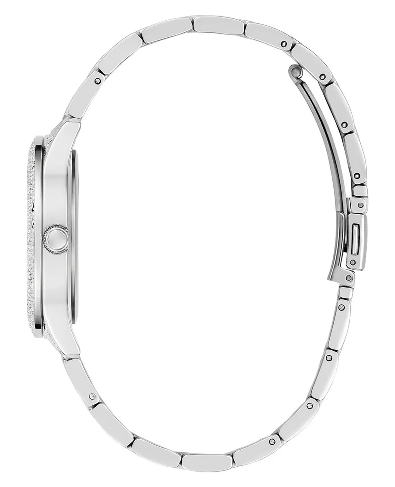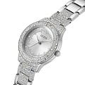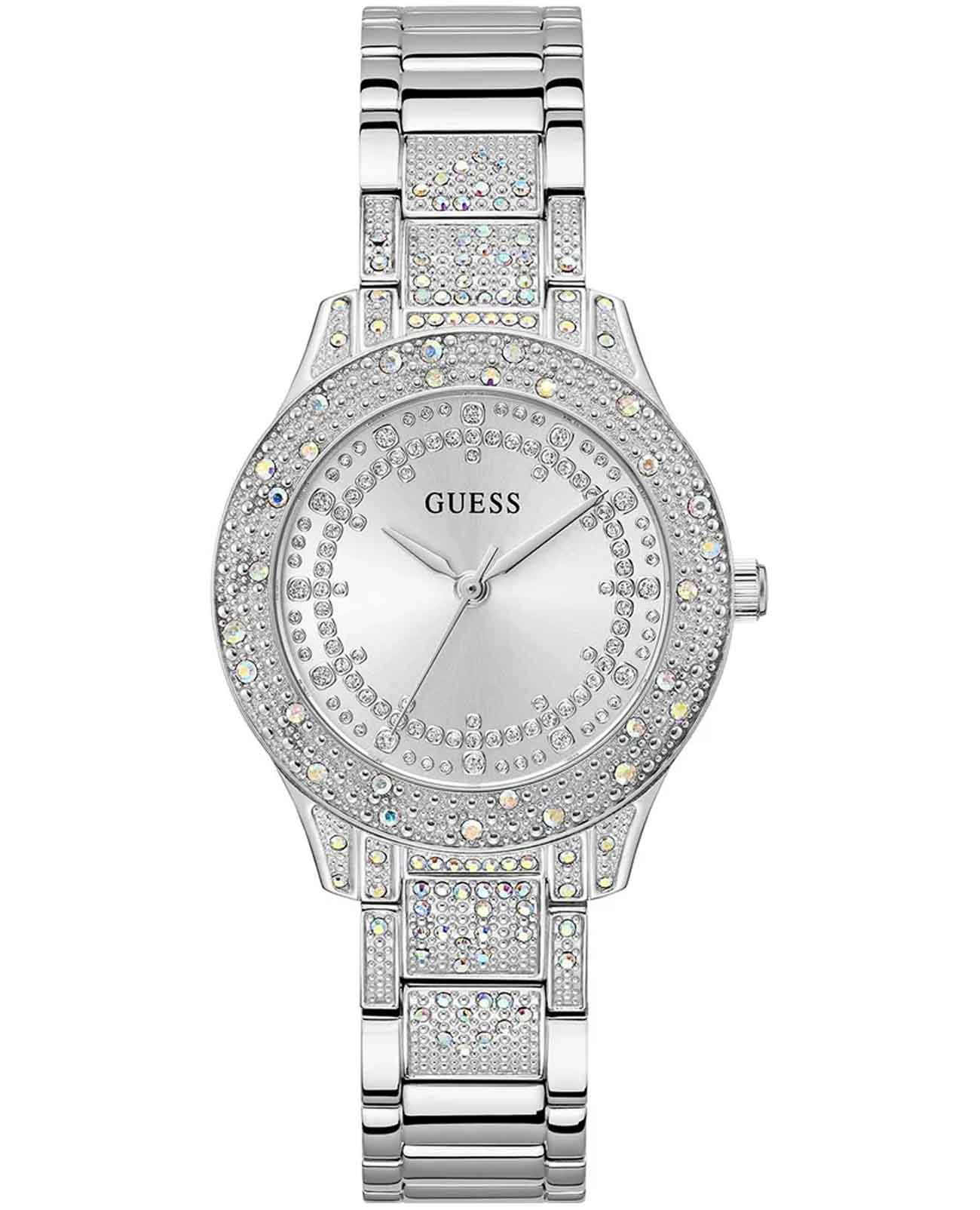 Женские наручные часы с минеральным стекломМинеральное стеклоМинеральное стекло представляет собой искусственно выращенный минерал кварца. Такое стекло отличается особой устойчивостью к повреждениям и царапинам. Уступает по некоторым качествам сапфировому стеклу. Guess Trend GW0746L1, кварцевый механизм с высокой точностью. Корпус часов изготовлен из стали. БезельБезельВнешний ободок, закрепляющий стекло. В спортивных часах так называется поворотное кольцо с делениями на циферблате, выполняет роль таймера – замеряет отрезки времени на шкале. Неподвижный безель – элемент декора. Однонаправленно вращающийся безель на дайверских часах позволяет фиксировать моменты погружения и выныривания на поверхность., корпус и циферблат украшены кристаллами. Класс водозащиты: 30 метров, позволит защитить корпус от случайных брызг или капель дождя. Стальной браслет на раскладной застёжкеРаскладная застёжкаТакой тип застёжки используется только на браслетах из металла. Она никогда не раскрывается полностью, происходит разделение на 2 и более частей. Раскладывающая застёжка снизит вероятность потери часов к минимуму..