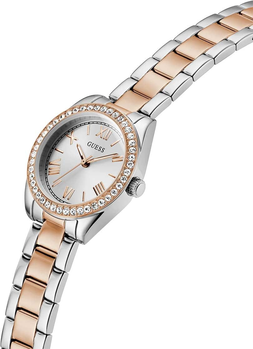 Эти элегантные часы Guess GW0841L3 станут идеальным дополнением для тех, кто стремится подчеркнуть свой стиль и уверенность. Оснащенные надежным кварцевым механизмом, они обеспечивают точность и долговечность. Круглый стальной корпус с полированной поверхностью придает часам современный и изысканный вид. БезельБезельВнешний ободок, закрепляющий стекло. В спортивных часах так называется поворотное кольцо с делениями на циферблате, выполняет роль таймера – замеряет отрезки времени на шкале. Неподвижный безель – элемент декора. Однонаправленно вращающийся безель на дайверских часах позволяет фиксировать моменты погружения и выныривания на поверхность. с IP-покрытиемIP-покрытиеМетод ионного напыления. Демонстрирует повышенную устойчивость к истиранию, окислению и химическим веществам. Под воздействием высокого давления и температуры около 1500°C молекулы металла надёжно соединяются с частицами корпуса часов. цвета розового золота украшен кристаллами, добавляющими дополнительный блеск и роскошь. Серебристый циферблат, выполненный по технологии Sunray, притягивает взгляды своим изысканным сиянием. Метки на циферблате представлены в виде штрихов и римских цифр, что подчеркивает классический стиль аксессуара. Люминесцентное покрытиеЛюминесцентное покрытиеПозволяет считывать показания времени в темноте. Производители наносят на стрелки, часовые индексы, безель или поверхность циферблата светонакопительный состав, дающий холодное свечение. на стрелках обеспечивает отличную видимость в темноте. Рифленая заводная головка обеспечивает удобство в настройке времени. Стальной браслет с частичным IP-покрытиемIP-покрытиеМетод ионного напыления. Демонстрирует повышенную устойчивость к истиранию, окислению и химическим веществам. Под воздействием высокого давления и температуры около 1500°C молекулы металла надёжно соединяются с частицами корпуса часов. цвета розового золота с раскладной застежкойРаскладная застёжкаТакой тип застёжки используется только на браслетах из металла. Она никогда не раскрывается полностью, происходит разделение на 2 и более частей. Раскладывающая застёжка снизит вероятность потери часов к минимуму. гарантирует комфортное ношение и надежную фиксацию на запястье. Часы обладают водозащитой 30WR, что делает их устойчивыми к случайным брызгам. Минеральное стеклоМинеральное стеклоМинеральное стекло представляет собой искусственно выращенный минерал кварца. Такое стекло отличается особой устойчивостью к повреждениям и царапинам. Уступает по некоторым качествам сапфировому стеклу. защищает циферблат от царапин и других повреждений.