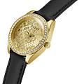 Женские наручные часы с минеральным стекломМинеральное стеклоМинеральное стекло представляет собой искусственно выращенный минерал кварца. Такое стекло отличается особой устойчивостью к повреждениям и царапинам. Уступает по некоторым качествам сапфировому стеклу. Guess Trend Boa GW0989L2 представляют собой элегантный аксессуар. Корпус диаметром 32 мм выполнен из стали с IP-покрытиемIP-покрытиеМетод ионного напыления. Демонстрирует повышенную устойчивость к истиранию, окислению и химическим веществам. Под воздействием высокого давления и температуры около 1500°C молекулы металла надёжно соединяются с частицами корпуса часов., что обеспечивает как привлекательный внешний вид, так и высокую прочность. Циферблат золотистого цвета стильно украшен логотипом компании, добавляющий изделию роскоши и шарма. Механизм часов кварцевый, что гарантирует точность хода времени без необходимости постоянного завода. БезельБезельВнешний ободок, закрепляющий стекло. В спортивных часах так называется поворотное кольцо с делениями на циферблате, выполняет роль таймера – замеряет отрезки времени на шкале. Неподвижный безель – элемент декора. Однонаправленно вращающийся безель на дайверских часах позволяет фиксировать моменты погружения и выныривания на поверхность. с кристаллами придают часам стильный и современный вид. Для защиты циферблата используется минеральным стеклоМинеральное стеклоМинеральное стекло представляет собой искусственно выращенный минерал кварца. Такое стекло отличается особой устойчивостью к повреждениям и царапинам. Уступает по некоторым качествам сапфировому стеклу., устойчивое к царапинам, сохраняющее первоначальный вид на протяжении длительного времени. Модель обладает водозащитой 3 АТМ, защищающий часы от случайных брызг воды, хотя они не подходят для плавания или занятий водными видами спорта. Стрелки покрыты люминесцентным покрытиемЛюминесцентное покрытиеПозволяет считывать показания времени в темноте. Производители наносят на стрелки, часовые индексы, безель или поверхность циферблата светонакопительный состав, дающий холодное свечение., обеспечивающим отличную читаемость в темноте. Ремешок часов изготовлен из кожи со стандартной застежкой, обеспечивающей комфортное ношение и безопасность. Часы GW0989L2 отличаются особой изысканностью благодаря декоративным элементам, таким как кристаллы.