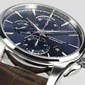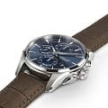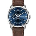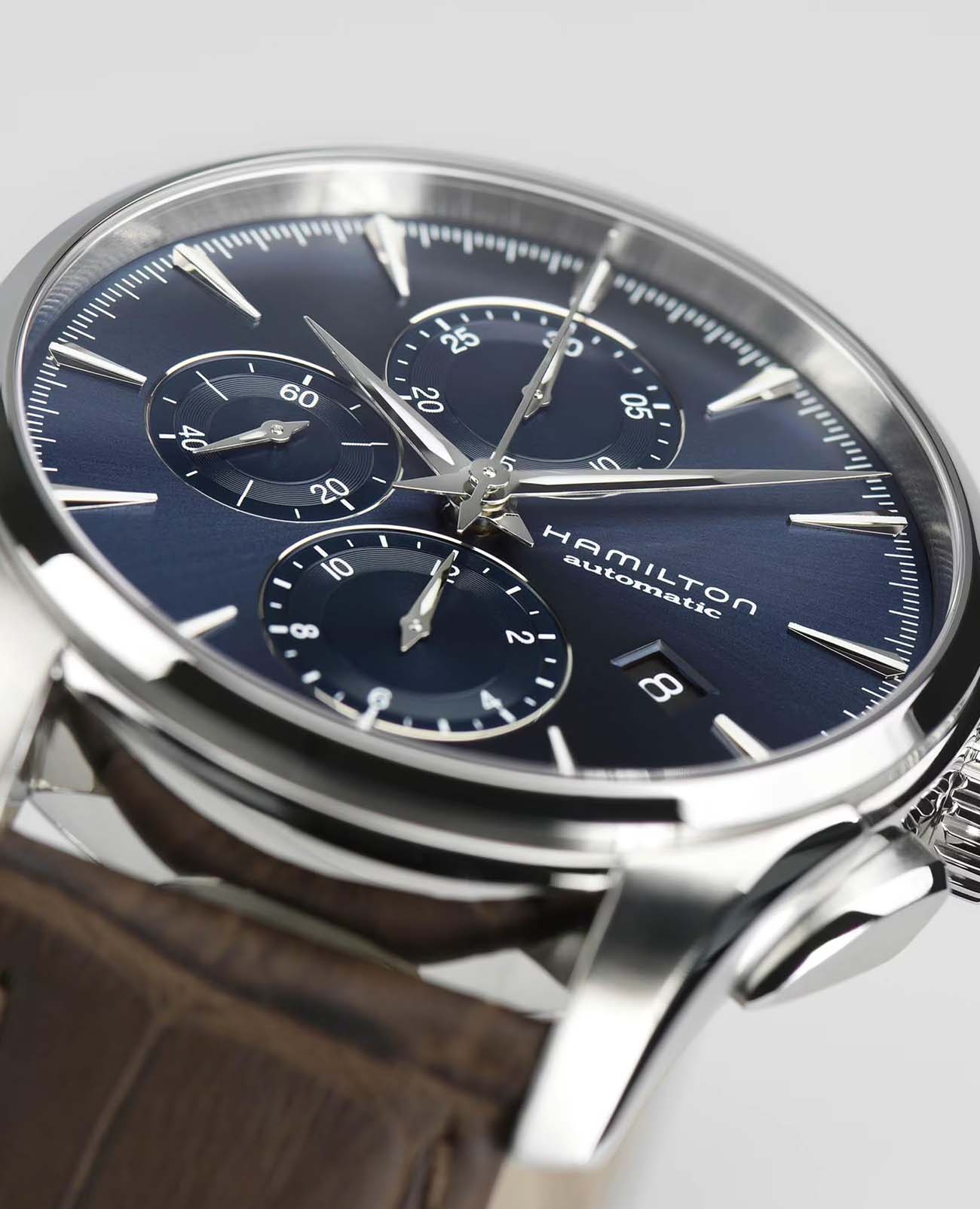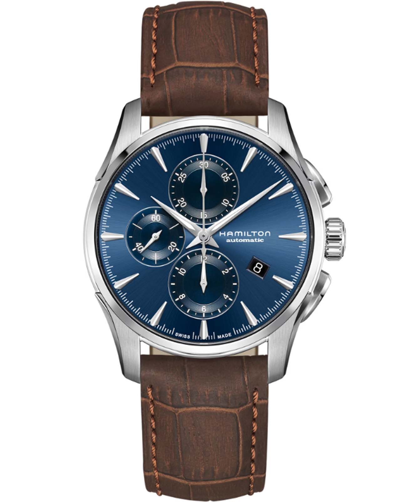 Часы-хронографХронографФункция позволяет измерять отрезки времени с особой точностью: часы, минуты, секунды. Верным признаком хронографа является наличие на циферблате 3 дополнительных окошек-счётчиков. Hamilton Jazzmaster Auto Chrono H32586541 с автоматическим механизмом высокой точности. Сапфировое стеклоСапфировое стеклоПрочный и надёжный материал из кристалла сапфира синтетического происхождения, характеризующийся особой твёрдостью и устойчивостью к царапинам и повреждениям. устойчивое к появлению царапин, обладающее высокой прозрачностью. Класс водозащиты: 100 метров, позволит плавать, нырять и заниматься другими водными видами спорта. Корпус часов изготовлен из нержавеющей стали. Практичный кожаный ремешок с раскладной застёжкойРаскладная застёжкаТакой тип застёжки используется только на браслетах из металла. Она никогда не раскрывается полностью, происходит разделение на 2 и более частей. Раскладывающая застёжка снизит вероятность потери часов к минимуму.. Стрелки и метки с люминесцентным покрытиемЛюминесцентное покрытиеПозволяет считывать показания времени в темноте. Производители наносят на стрелки, часовые индексы, безель или поверхность циферблата светонакопительный состав, дающий холодное свечение.. Окошко даты находится в положении 4 часа.