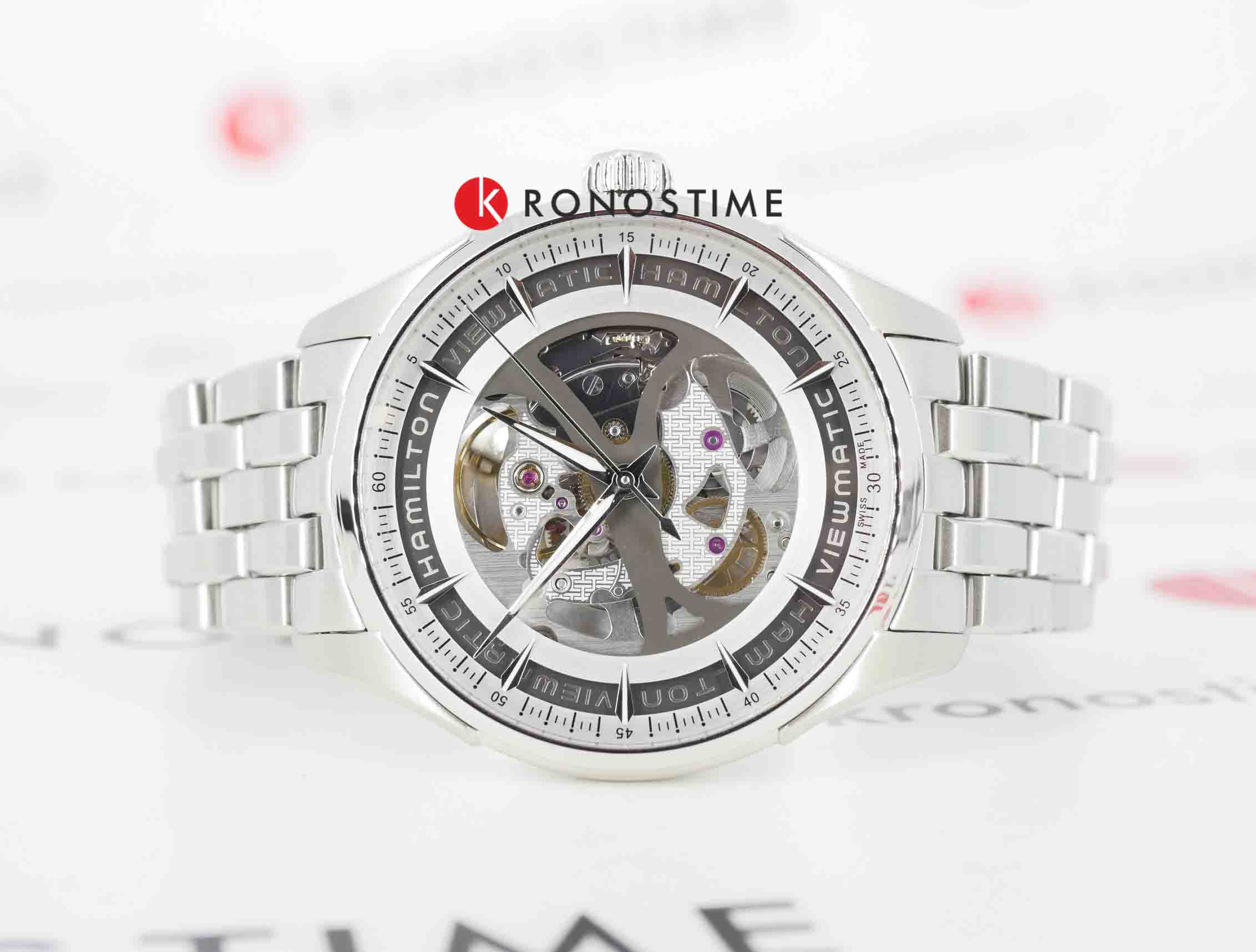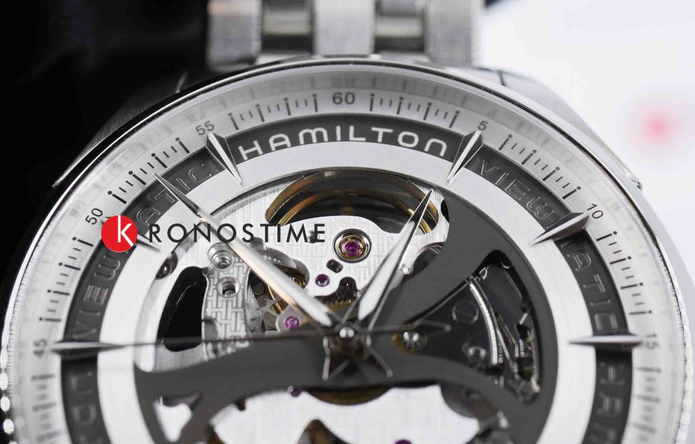 Мужские механические швейцарские часы-скелетоны Hamilton Jazzmaster Viewmatic Skeleton Gent Auto H42555151. Корпус и браслет часов изготовлены из нержавеющей стали. Стальной браслет на застёжке-бабочке с кнопкамиЗастёжка "бабочка"Такой вид застёжки дополняется предохранителями, помогающими избежать случайного раскрытия браслета. Обладают изящным исполнением. . Сапфировое стеклоСапфировое стеклоПрочный и надёжный материал из кристалла сапфира синтетического происхождения, характеризующийся особой твёрдостью и устойчивостью к царапинам и повреждениям. устойчивое к мелким механическим повреждениям. Класс водозащиты: 50 метров, позволит защитить корпус от случайных брызг или капель дождя. Стрелки и метки с люминесцентным покрытиемЛюминесцентное покрытиеПозволяет считывать показания времени в темноте. Производители наносят на стрелки, часовые индексы, безель или поверхность циферблата светонакопительный состав, дающий холодное свечение..