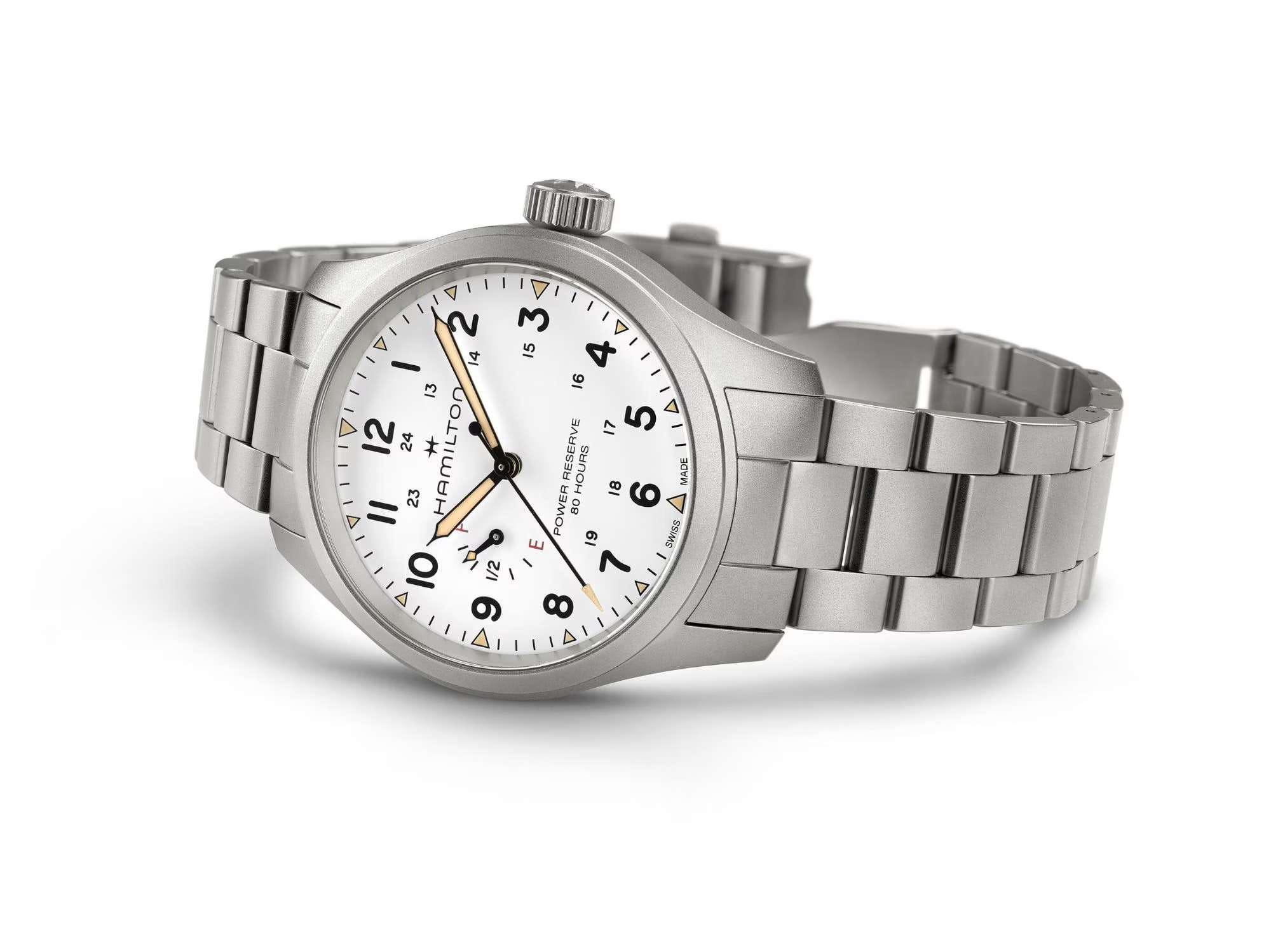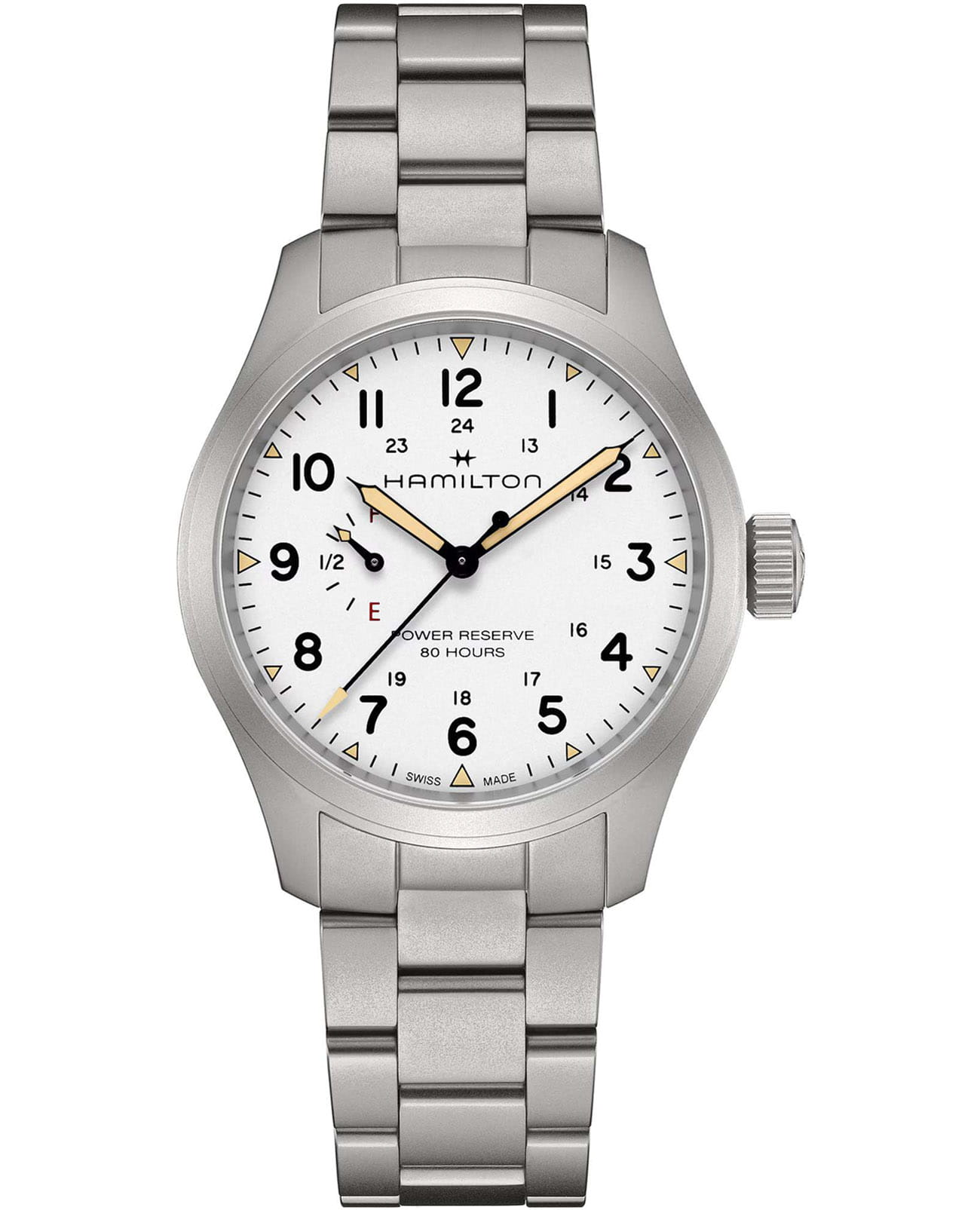 Мужские наручные часы Hamilton Khaki Field Mechanical Power Reserve 40mm H69509110 сочетают в себе спортивный стиль и элегантный дизайн. Модель обладает круглым корпусом диаметром 40 мм, изготовленным из нержавеющей стали, что обеспечивает высокую устойчивость к внешним воздействиям. Изысканный браслет выполнен из нержавеющей стали  с раскладной застёжкойРаскладная застёжкаТакой тип застёжки используется только на браслетах из металла. Она никогда не раскрывается полностью, происходит разделение на 2 и более частей. Раскладывающая застёжка снизит вероятность потери часов к минимуму., гарантирующей комфортное ношение и безопасность. Лаконичный циферблат оснащен крупными цифрами и стрелками с люминесцентным покрытиемЛюминесцентное покрытиеПозволяет считывать показания времени в темноте. Производители наносят на стрелки, часовые индексы, безель или поверхность циферблата светонакопительный состав, дающий холодное свечение. Super-LumiNova®, обеспечивающим превосходную видимость в темноте. Для защиты используется сапфировое стеклоСапфировое стеклоПрочный и надёжный материал из кристалла сапфира синтетического происхождения, характеризующийся особой твёрдостью и устойчивостью к царапинам и повреждениям., которое эффективно противостоит царапинам и имеет антибликовое покрытиеАнтибликовое покрытиеСлой оксида металла в 0,13-0,3 микрон, благодаря которому стекло часов не бликует и не отражает свет. Антибликовое покрытие уменьшает отражение света в 10 раз, обеспечивая отличную читаемость показателей циферблата.. Часы работают с помощью механизма H-23. На циферблате также буквы «F» для обозначения полного заряда и «E» для обозначения пустого заряда, что подчеркивает эту исключительную и практичную функцию. Водонепроницаемость часов достигает 10 атмосфер (100 метров), делающая их подходящими для повседневного использования и активного отдыха. Это сочетание высокой прочности, точности и изысканного дизайна для уверенных в себе мужчин.