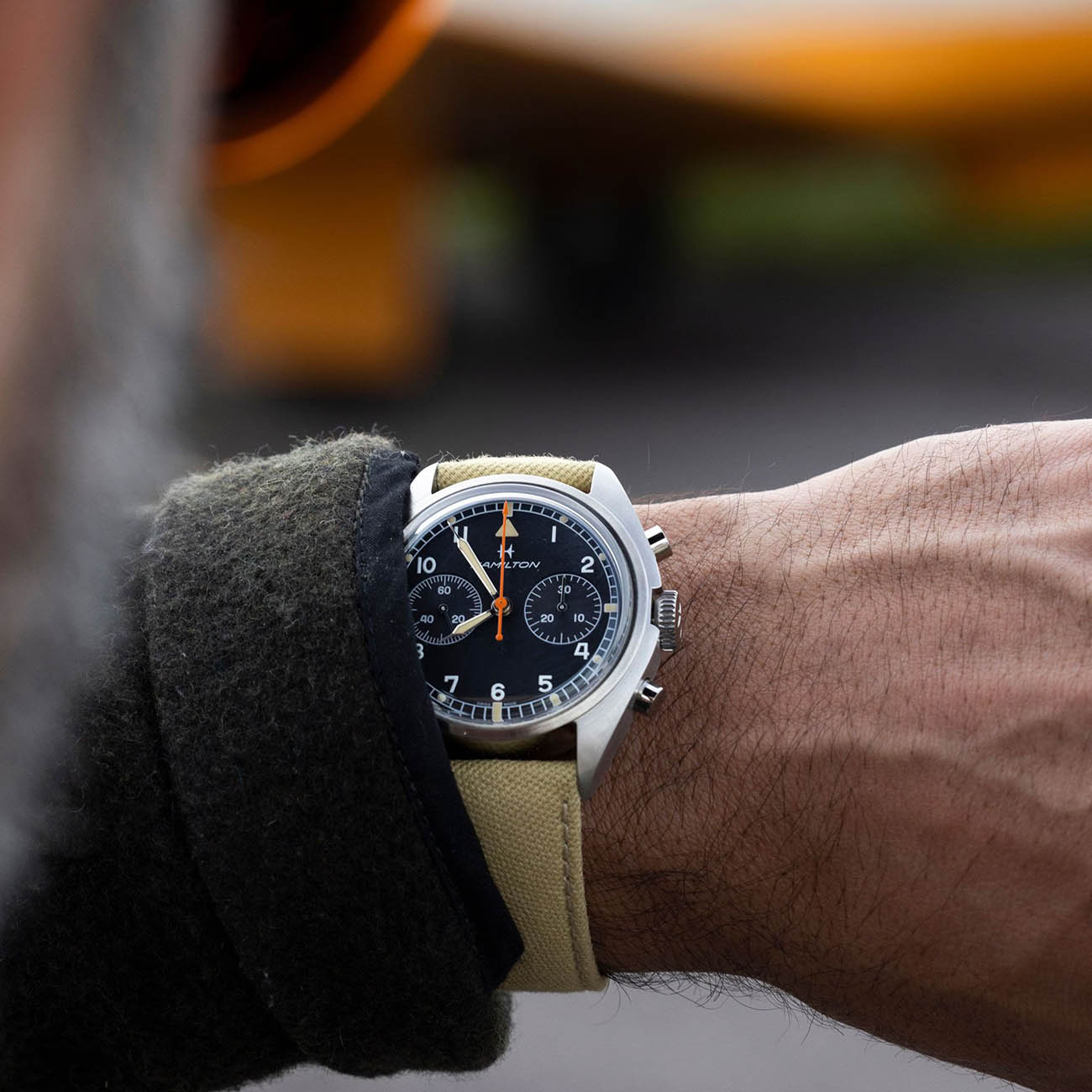 Мужские швейцарские часы Hamilton Khaki Pilot Pioneer Mechanical Chronograph Limited Edition H89429930 — лимитированный выпуск, созданный в коллаборации с Hodinkee как дань уважения хронографам британских ВВС 1970-х годов. Стальной корпус диаметром 40 мм с асимметричным дизайном и увеличенной толщиной 14,35 мм подчеркивает брутальность модели, а сапфировое стеклоСапфировое стеклоПрочный и надёжный материал из кристалла сапфира синтетического происхождения, характеризующийся особой твёрдостью и устойчивостью к царапинам и повреждениям. с двойным антибликовым покрытием обеспечивает превосходную читаемость матового черного циферблата со стрелками с люминесцентным покрытиемЛюминесцентное покрытиеПозволяет считывать показания времени в темноте. Производители наносят на стрелки, часовые индексы, безель или поверхность циферблата светонакопительный состав, дающий холодное свечение.. Модель оснащена функцией хронографаХронографФункция позволяет измерять отрезки времени с особой точностью: часы, минуты, секунды. Верным признаком хронографа является наличие на циферблате 3 дополнительных окошек-счётчиков.. Оранжевая центральная хронографная стрелка сохраняют историческую точность, отсылая к инструментам пилотов самолетов. Механизм с ручным заводом H-51-Si на базе Valjoux 7733 оснащен кремниевой спиралью, обеспечивающей запас хода 60 часов и устойчивость к магнитным полям . Ударопрочный корпусУдаропрочный корпусМеханизм заключён в корпус, выполненный из современных материалов, устойчивых к ударам, механическим повреждениям и падению с высоты: инновационный пластик, карбон, нержавеющая сталь, титан. с водонепроницаемостью 10 бар (100 м) сочетается с бежевым нейлоновым ремешком шириной 22 мм.