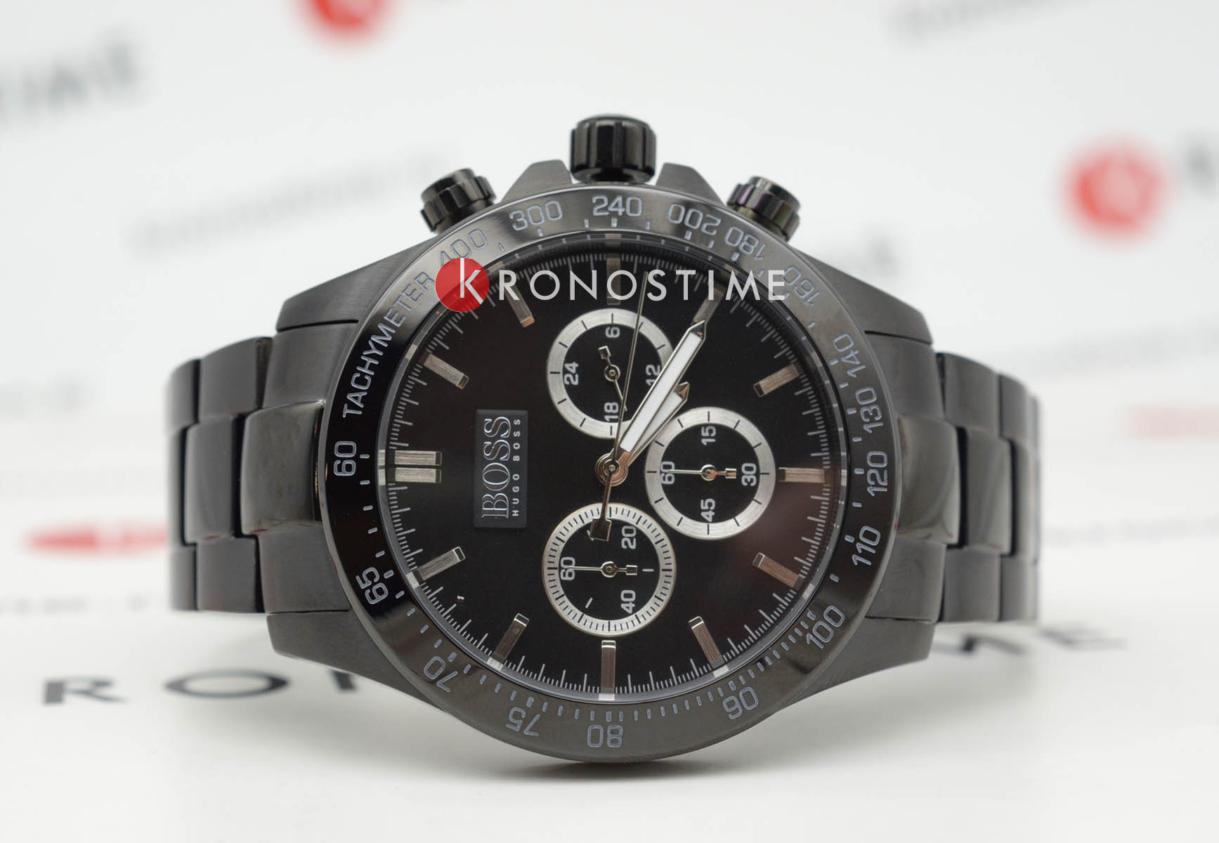 Мужские часы Hugo Boss Ikon HB1512961 сочетают спортивный стиль с элегантностью в матовом черном корпусе из нержавеющей стали с IP-покрытиемIP-покрытиеМетод ионного напыления. Демонстрирует повышенную устойчивость к истиранию, окислению и химическим веществам. Под воздействием высокого давления и температуры около 1500°C молекулы металла надёжно соединяются с частицами корпуса часов. диаметром 44 мм. Модель оснащена кварцевым механизмом с функцией хронографаХронографФункция позволяет измерять отрезки времени с особой точностью: часы, минуты, секунды. Верным признаком хронографа является наличие на циферблате 3 дополнительных окошек-счётчиков. и тахиметрической шкалойТахиметрРазмеченная шкала, располагается на ободке или безеле часов. Тахиметр позволяет рассчитать скорость на определённом участке пути, расстояние измеряется в километрах или милях. на безелеБезельВнешний ободок, закрепляющий стекло. В спортивных часах так называется поворотное кольцо с делениями на циферблате, выполняет роль таймера – замеряет отрезки времени на шкале. Неподвижный безель – элемент декора. Однонаправленно вращающийся безель на дайверских часах позволяет фиксировать моменты погружения и выныривания на поверхность.. Черный циферблат с рельефными метками и 24-часовой шкалой защищен прочным минеральным стекломМинеральное стеклоМинеральное стекло представляет собой искусственно выращенный минерал кварца. Такое стекло отличается особой устойчивостью к повреждениям и царапинам. Уступает по некоторым качествам сапфировому стеклу., устойчивым к царапинам. Стальной браслет с черным покрытием обеспечивает удобную посадку, а ударопрочная конструкцияУдаропрочный корпусМеханизм заключён в корпус, выполненный из современных материалов, устойчивых к ударам, механическим повреждениям и падению с высоты: инновационный пластик, карбон, нержавеющая сталь, титан. с делает часы надежным спутником в повседневной жизни