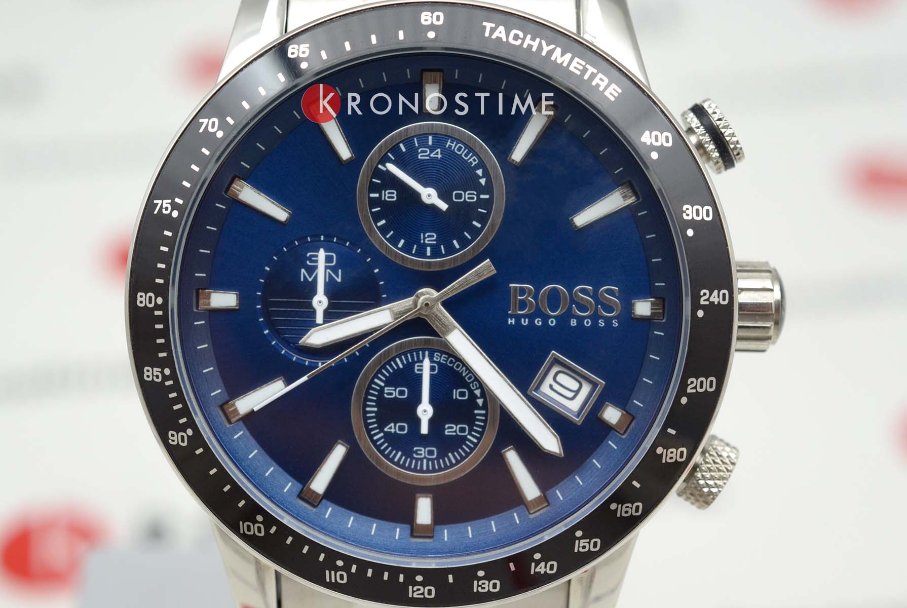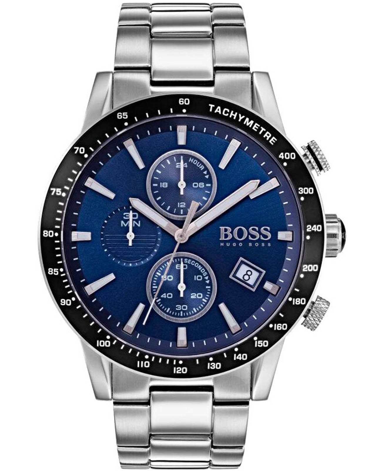 Мужские часы Hugo Boss Rafale Blue HB1513510 представлены в круглом 44-мм корпусе из нержавеющей стали. Часы оснащены кварцевым механизмом с функциями хронографаХронографФункция позволяет измерять отрезки времени с особой точностью: часы, минуты, секунды. Верным признаком хронографа является наличие на циферблате 3 дополнительных окошек-счётчиков., секундомеромСекундомерСекундоме́р — прибор, способный измерять интервалы времени с точностью до долей секунды., а также тахиметрической шкалой на неподвижном безелеБезельВнешний ободок, закрепляющий стекло. В спортивных часах так называется поворотное кольцо с делениями на циферблате, выполняет роль таймера – замеряет отрезки времени на шкале. Неподвижный безель – элемент декора. Однонаправленно вращающийся безель на дайверских часах позволяет фиксировать моменты погружения и выныривания на поверхность. с IP-покрытиемIP-покрытиеМетод ионного напыления. Демонстрирует повышенную устойчивость к истиранию, окислению и химическим веществам. Под воздействием высокого давления и температуры около 1500°C молекулы металла надёжно соединяются с частицами корпуса часов. для расчетов скорости. Окошко даты на позиции 4 часа. Эффектный синий циферблат защищен минеральным стекломМинеральное стеклоМинеральное стекло представляет собой искусственно выращенный минерал кварца. Такое стекло отличается особой устойчивостью к повреждениям и царапинам. Уступает по некоторым качествам сапфировому стеклу.. Люминесцентное покрытиеЛюминесцентное покрытиеПозволяет считывать показания времени в темноте. Производители наносят на стрелки, часовые индексы, безель или поверхность циферблата светонакопительный состав, дающий холодное свечение. на стрелках и метках обеспечивает отличную видимость в темноте. Стальной браслет с раскладной застёжкойРаскладная застёжкаТакой тип застёжки используется только на браслетах из металла. Она никогда не раскрывается полностью, происходит разделение на 2 и более частей. Раскладывающая застёжка снизит вероятность потери часов к минимуму. обеспечивает удобную посадку. Водонепроницаемость 50 метров (5 ATM) защищает от брызг. Эта модель станет отличным выбором для тех, кто ценит стиль и функциональность в одном аксессуаре.