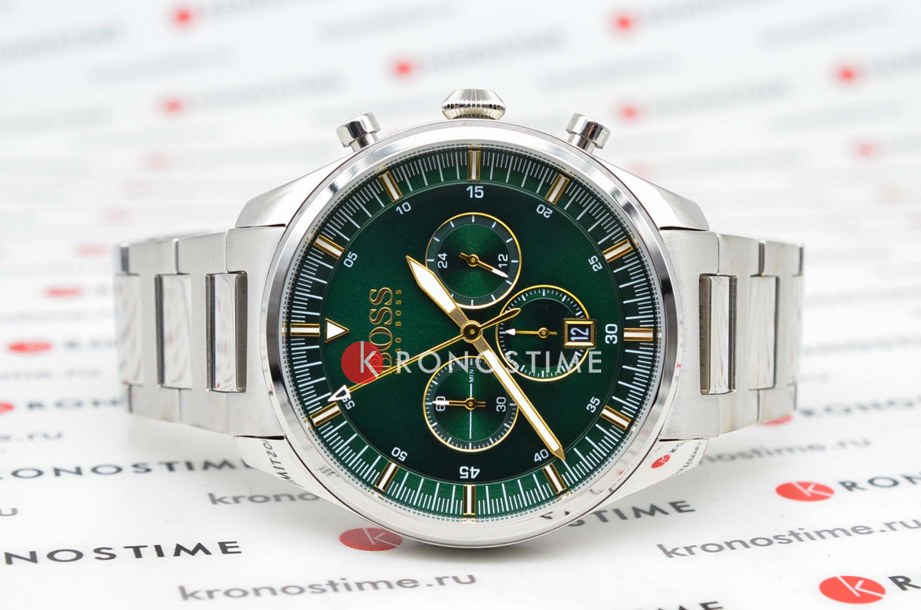 Мужские часы Hugo Boss Pioneer HB1513868 представлены в круглом 44-мм корпусе из нержавеющей стали. Оснащены кварцевым механизмом с функциями хронографаХронографФункция позволяет измерять отрезки времени с особой точностью: часы, минуты, секунды. Верным признаком хронографа является наличие на циферблате 3 дополнительных окошек-счётчиков. и секундомеромСекундомерСекундоме́р — прибор, способный измерять интервалы времени с точностью до долей секунды., а также индикацией даты. Зеленый циферблат с метками в виде штрихов защищен устойчивым к царапинам минеральным стекломМинеральное стеклоМинеральное стекло представляет собой искусственно выращенный минерал кварца. Такое стекло отличается особой устойчивостью к повреждениям и царапинам. Уступает по некоторым качествам сапфировому стеклу.. Браслет из стали дополнен раскладной застёжкойРаскладная застёжкаТакой тип застёжки используется только на браслетах из металла. Она никогда не раскрывается полностью, происходит разделение на 2 и более частей. Раскладывающая застёжка снизит вероятность потери часов к минимуму.. Водонепроницаемость 50 метров (5 ATM) обеспечивает защиту от брызг и дождя.