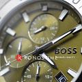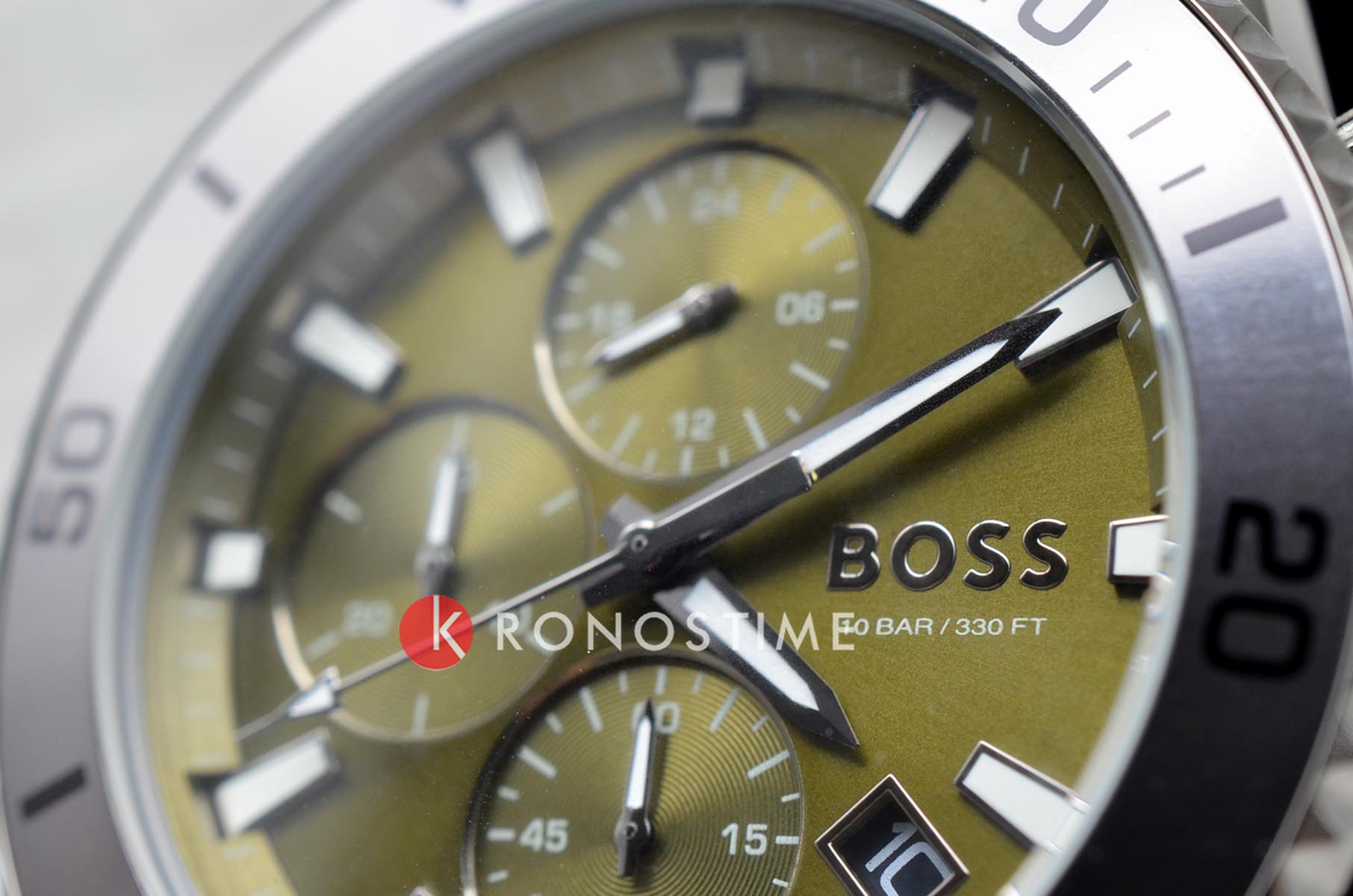 Мужские часы Hugo Boss Admiral HB1513967 представлены в круглом 46-мм корпусе из нержавеющей стали с IP-покрытиемIP-покрытиеМетод ионного напыления. Демонстрирует повышенную устойчивость к истиранию, окислению и химическим веществам. Под воздействием высокого давления и температуры около 1500°C молекулы металла надёжно соединяются с частицами корпуса часов.. Оснащены кварцевым механизмом с функциями хронографаХронографФункция позволяет измерять отрезки времени с особой точностью: часы, минуты, секунды. Верным признаком хронографа является наличие на циферблате 3 дополнительных окошек-счётчиков. и секундомеромСекундомерСекундоме́р — прибор, способный измерять интервалы времени с точностью до долей секунды. на безелеБезельВнешний ободок, закрепляющий стекло. В спортивных часах так называется поворотное кольцо с делениями на циферблате, выполняет роль таймера – замеряет отрезки времени на шкале. Неподвижный безель – элемент декора. Однонаправленно вращающийся безель на дайверских часах позволяет фиксировать моменты погружения и выныривания на поверхность.. Зеленый циферблат защищен устойчивым к царапинам минеральным стекломМинеральное стеклоМинеральное стекло представляет собой искусственно выращенный минерал кварца. Такое стекло отличается особой устойчивостью к повреждениям и царапинам. Уступает по некоторым качествам сапфировому стеклу.. Силиконовый ремешок черного цвета дополнен стандартной застежкой, а стрелки покрыты люминесцентным составомЛюминесцентное покрытиеПозволяет считывать показания времени в темноте. Производители наносят на стрелки, часовые индексы, безель или поверхность циферблата светонакопительный состав, дающий холодное свечение. для видимости в темноте. Водонепроницаемость 100 метров (10 ATM) позволяет использовать часы для плавания.
