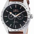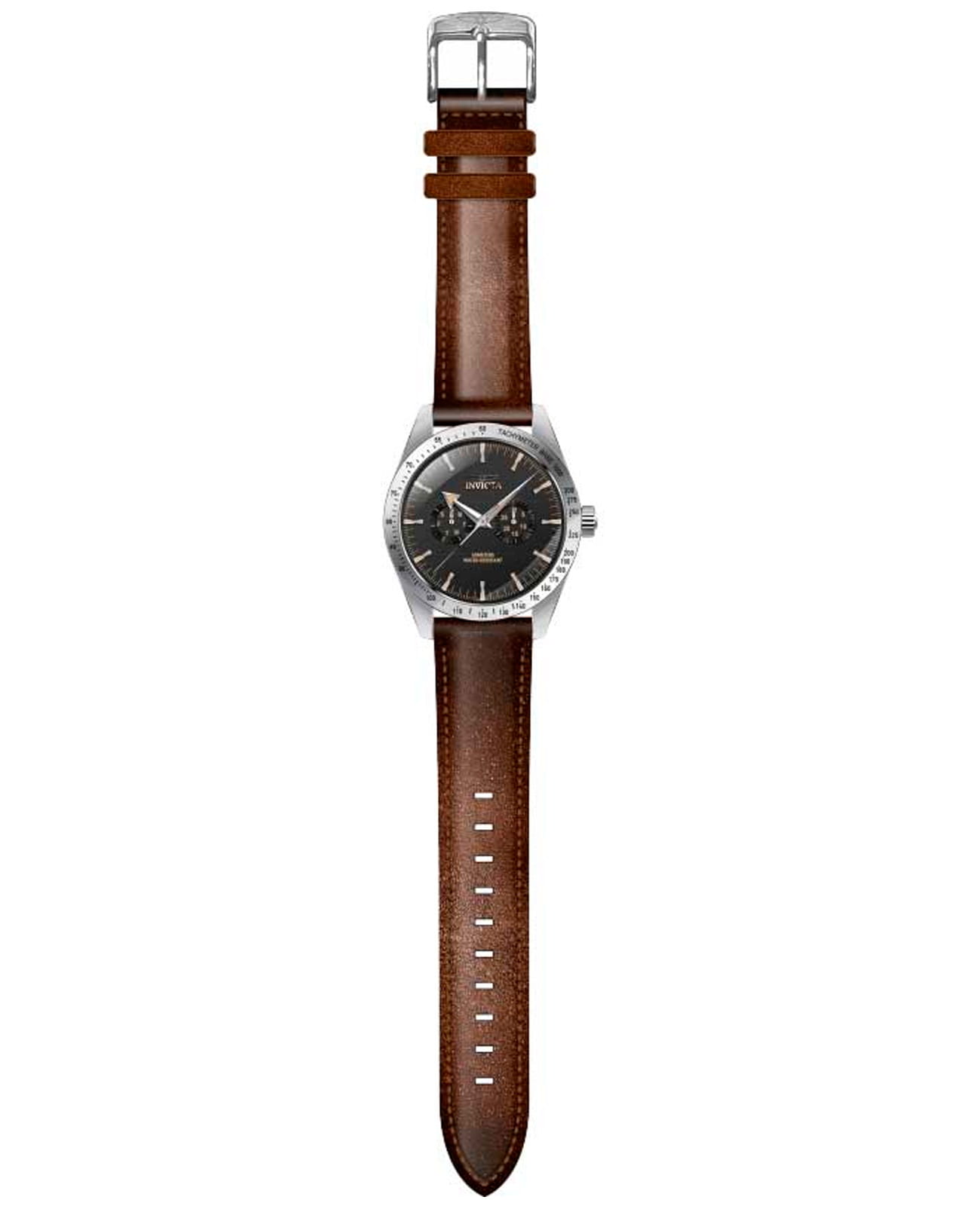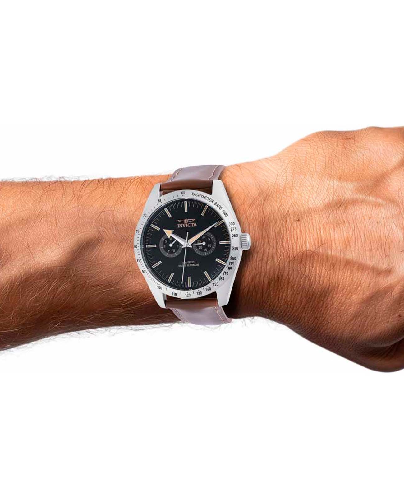 Мужские наручные часы Invicta Specialty IN45973 из коллекции Specialty сочетают в себе спортивный дизайн и надежность современных технологий. Модель обладает круглым корпусом диаметром 44 мм, выполненным из нержавеющей стали, что обеспечивает высокую устойчивость к внешним воздействиям. БезельБезельВнешний ободок, закрепляющий стекло. В спортивных часах так называется поворотное кольцо с делениями на циферблате, выполняет роль таймера – замеряет отрезки времени на шкале. Неподвижный безель – элемент декора. Однонаправленно вращающийся безель на дайверских часах позволяет фиксировать моменты погружения и выныривания на поверхность. украшен тахиметрической шкалой, придающей часам дополнительную элегантность. Кожаный ремешок на стандартной застежке, гарантирует комфортное ношение и безопасность. Черный циферблат дополнен метками в виде штрихов и светящимися стрелками с люминесцентным покрытиемЛюминесцентное покрытиеПозволяет считывать показания времени в темноте. Производители наносят на стрелки, часовые индексы, безель или поверхность циферблата светонакопительный состав, дающий холодное свечение. Tritnite, которые обеспечивают отличную видимость даже в темноте . На циферблате также вынесены отдельные окна для даты, дня недели и индикация 12-ти и 24-х часового формата времени . Для защиты используется минеральное стеклоМинеральное стеклоМинеральное стекло представляет собой искусственно выращенный минерал кварца. Такое стекло отличается особой устойчивостью к повреждениям и царапинам. Уступает по некоторым качествам сапфировому стеклу. Flame Fusion, которое обеспечивает прочность и устойчивость к царапинам .  Часы оснащены кварцевым механизмом калибра Seiko TMI VH64, что гарантирует точность хода без необходимости подзаводки . Водонепроницаемость часов достигает 50 метров (5 атмосфер), что позволяет использовать их во время мытья рук или плавания, однако не рекомендуется для глубоководного дайвинга . Сочетание практичности, надежности и стильного дизайна делает эту модель универсальным аксессуаром как для повседневной носки, так и для занятий спортом .