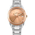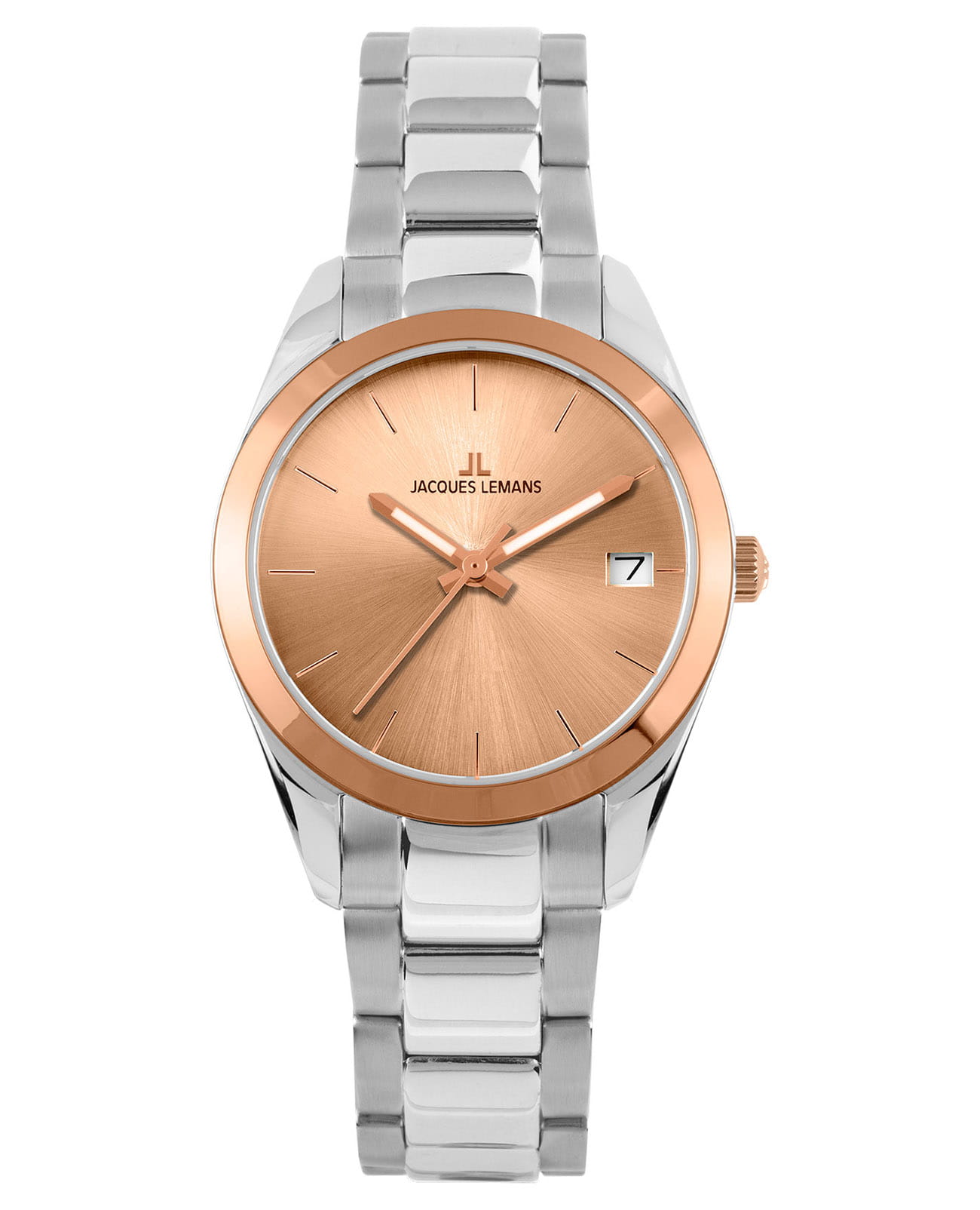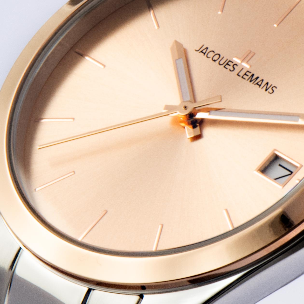 Женские часы Jacques Lemans Classic 1-1878F с минеральным стекломМинеральное стеклоМинеральное стекло представляет собой искусственно выращенный минерал кварца. Такое стекло отличается особой устойчивостью к повреждениям и царапинам. Уступает по некоторым качествам сапфировому стеклу., кварцевый механизм с высокой точностью. Корпус из нержавеющей стали. Неподвижный безельБезельВнешний ободок, закрепляющий стекло. В спортивных часах так называется поворотное кольцо с делениями на циферблате, выполняет роль таймера – замеряет отрезки времени на шкале. Неподвижный безель – элемент декора. Однонаправленно вращающийся безель на дайверских часах позволяет фиксировать моменты погружения и выныривания на поверхность. из нержавеющей стали с PVDPVDУльтратонкое покрытие наносится в технике вакуумного напыления, сочетает в себе нитрид титана особой прочности со слоем золота или оксида хрома. Несёт в себе декоративную или защитную функцию. покрытием. Стрелки с люминесцентным покрытиемЛюминесцентное покрытиеПозволяет считывать показания времени в темноте. Производители наносят на стрелки, часовые индексы, безель или поверхность циферблата светонакопительный состав, дающий холодное свечение.. Окошко даты расположено в позиции «3 часа».  Класс водозащиты: 100 метров, позволит плавать, нырять и заниматься другими водными видами спорта. Браслет из нержавеющей стали на раскладной застёжкеРаскладная застёжкаТакой тип застёжки используется только на браслетах из металла. Она никогда не раскрывается полностью, происходит разделение на 2 и более частей. Раскладывающая застёжка снизит вероятность потери часов к минимуму..