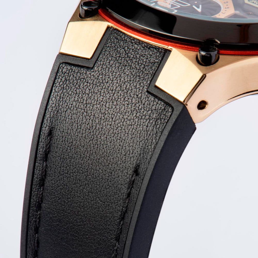 Ремешок часов состоит из двух частей: верхняя сделана из натуральной кожи черного цвета, нижняя — из силикона, удобного современного материала, который не боится повышенной влажности.
