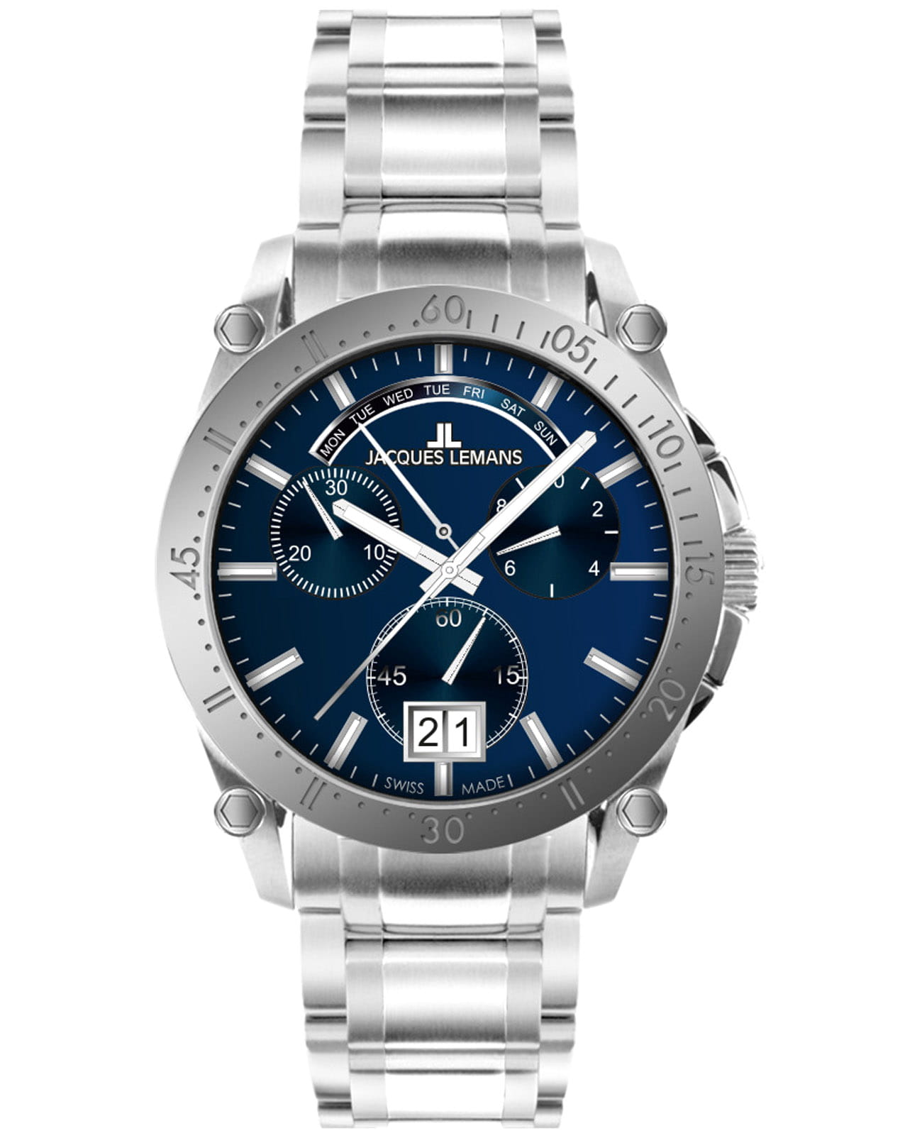Мужские часы-хронографХронографФункция позволяет измерять отрезки времени с особой точностью: часы, минуты, секунды. Верным признаком хронографа является наличие на циферблате 3 дополнительных окошек-счётчиков. Jacques Lemans 1-2198E – лаконичная красота и изысканная элегантность. Оригинальная модель с классическим оформлением станет превосходным завершением образа, наделив его индивидуальным характером. Корпус выполнен из нержавеющей стали, диаметром 44 мм, что обеспечивает долговечность и утончённый внешний вид. Ударопрочное минеральное стеклоМинеральное стеклоМинеральное стекло представляет собой искусственно выращенный минерал кварца. Такое стекло отличается особой устойчивостью к повреждениям и царапинам. Уступает по некоторым качествам сапфировому стеклу. с сапфировым напылением защищает циферблат от царапин. Стальной браслет на раскладной застёжкеРаскладная застёжкаТакой тип застёжки используется только на браслетах из металла. Она никогда не раскрывается полностью, происходит разделение на 2 и более частей. Раскладывающая застёжка снизит вероятность потери часов к минимуму. обеспечивает комфортное ношение. Водозащита 100 метров позволит плавать, нырять и заниматься другими водными видами спорта. Стрелки и метки с люминесцентным покрытиемЛюминесцентное покрытиеПозволяет считывать показания времени в темноте. Производители наносят на стрелки, часовые индексы, безель или поверхность циферблата светонакопительный состав, дающий холодное свечение. позволяющие легко определять время даже в темноте. Окошко даты находится в положении 6 часов. Широкое окошко дня недели в положении 12 часов позволяет показывать название дня недели. Это аксессуар для мужчины, который ценит классический стиль и функциональность.
