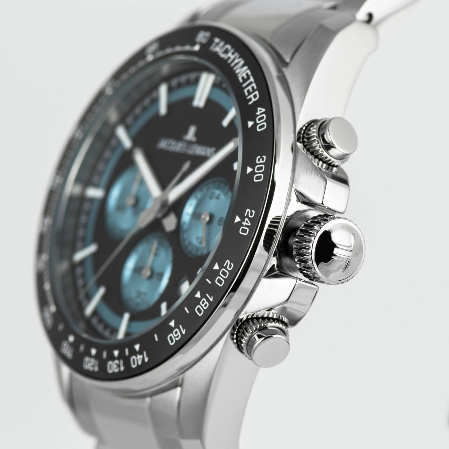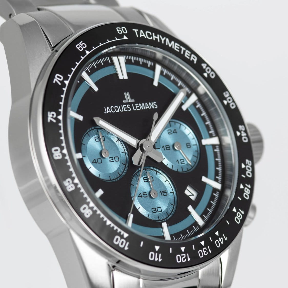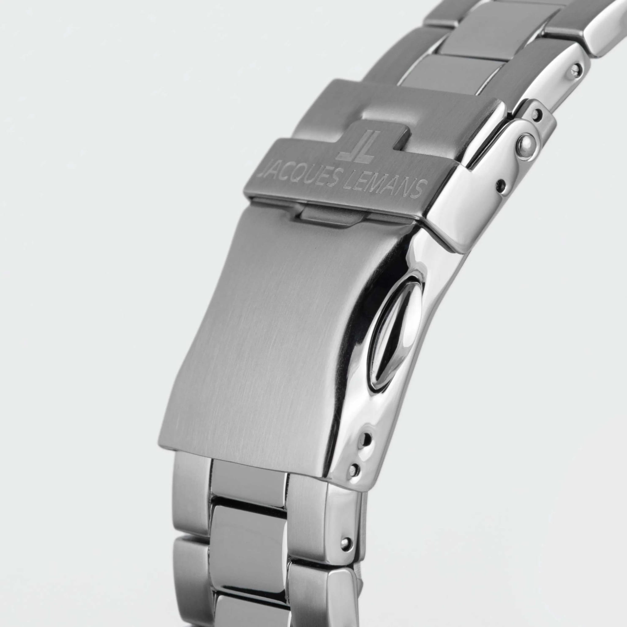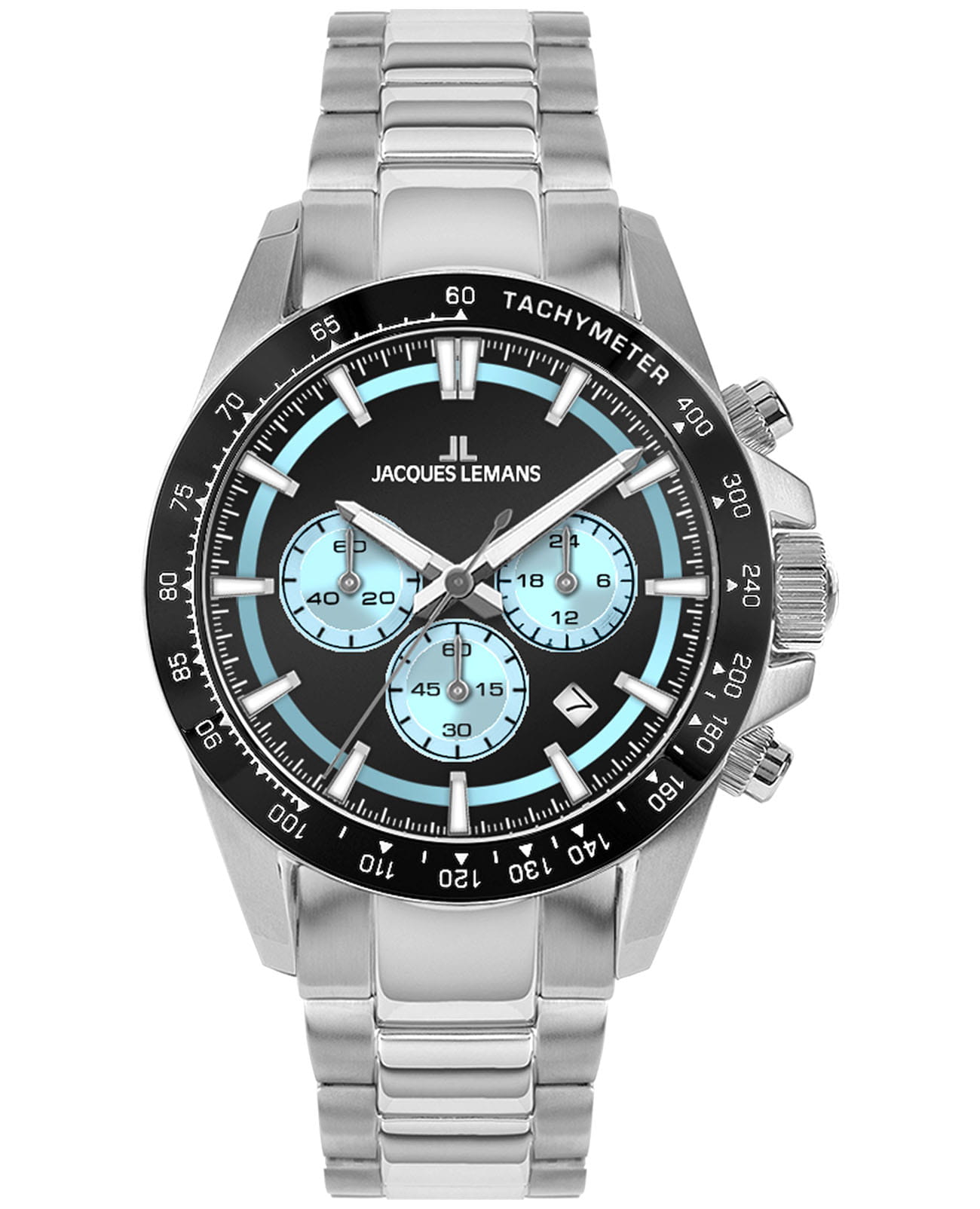 Мужские кварцевые часы-хронографХронографФункция позволяет измерять отрезки времени с особой точностью: часы, минуты, секунды. Верным признаком хронографа является наличие на циферблате 3 дополнительных окошек-счётчиков. с секундомеромСекундомерСекундоме́р — прибор, способный измерять интервалы времени с точностью до долей секунды. Jacques Lemans 1-2207B – лаконичная красота и изысканная элегантность. Оригинальная модель с классическим оформлением станет превосходным завершением образа, наделив его индивидуальным характером. Корпус выполнен из нержавеющей стали серебристого цвета, диаметром 43 мм, что обеспечивает долговечность и утончённый внешний вид. Минеральное стеклоМинеральное стеклоМинеральное стекло представляет собой искусственно выращенный минерал кварца. Такое стекло отличается особой устойчивостью к повреждениям и царапинам. Уступает по некоторым качествам сапфировому стеклу. повышенной прочности Crystex защищает циферблат от царапин. Неподвижный безельБезельВнешний ободок, закрепляющий стекло. В спортивных часах так называется поворотное кольцо с делениями на циферблате, выполняет роль таймера – замеряет отрезки времени на шкале. Неподвижный безель – элемент декора. Однонаправленно вращающийся безель на дайверских часах позволяет фиксировать моменты погружения и выныривания на поверхность. с PVD-покрытиемPVDУльтратонкое покрытие наносится в технике вакуумного напыления, сочетает в себе нитрид титана особой прочности со слоем золота или оксида хрома. Несёт в себе декоративную или защитную функцию. и тахиметромТахиметрРазмеченная шкала, располагается на ободке или безеле часов. Тахиметр позволяет рассчитать скорость на определённом участке пути, расстояние измеряется в километрах или милях.. Стальной браслет на раскладной застёжке с фиксаторомРаскладная застёжкаТакой тип застёжки используется только на браслетах из металла. Она никогда не раскрывается полностью, происходит разделение на 2 и более частей. Раскладывающая застёжка снизит вероятность потери часов к минимуму. обеспечивает комфортное ношение Водозащита 200 метров позволит плавать, нырять и заниматься другими водными видами спорта. Стрелки и метки с люминесцентным покрытиемЛюминесцентное покрытиеПозволяет считывать показания времени в темноте. Производители наносят на стрелки, часовые индексы, безель или поверхность циферблата светонакопительный состав, дающий холодное свечение. позволяющие легко определять время даже в темноте. 12-ти и 24-х часовой формат времени. Окошко даты находится в положении между 4 и 5 часами. Рифленая заводная головка с защитой. Это аксессуар для мужчины, который ценит классический стиль и функциональность.