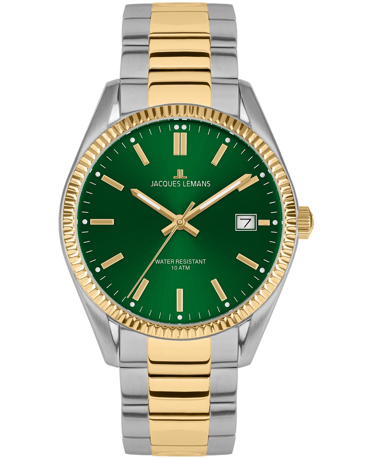 Женские наручные часы, выпущенные в честь 50-летия компании Jacques Lemans. Кварцевый механизм с высокой точностью. Минеральное стеклоМинеральное стеклоМинеральное стекло представляет собой искусственно выращенный минерал кварца. Такое стекло отличается особой устойчивостью к повреждениям и царапинам. Уступает по некоторым качествам сапфировому стеклу. устойчивое к появлению царапин, обладающее высокой прозрачностью. Окошко даты расположилось на трех часах. Стрелки и метки с люминесцентным покрытиемЛюминесцентное покрытиеПозволяет считывать показания времени в темноте. Производители наносят на стрелки, часовые индексы, безель или поверхность циферблата светонакопительный состав, дающий холодное свечение.. БезельБезельВнешний ободок, закрепляющий стекло. В спортивных часах так называется поворотное кольцо с делениями на циферблате, выполняет роль таймера – замеряет отрезки времени на шкале. Неподвижный безель – элемент декора. Однонаправленно вращающийся безель на дайверских часах позволяет фиксировать моменты погружения и выныривания на поверхность. с PVD-покрытиемPVDУльтратонкое покрытие наносится в технике вакуумного напыления, сочетает в себе нитрид титана особой прочности со слоем золота или оксида хрома. Несёт в себе декоративную или защитную функцию.. Класс водозащиты: 100 метров, позволит плавать, нырять и заниматься другими водными видами спорта. Корпус из нержавеющей стали. Браслет часов изготовлен из нержавеющей стали с частичным PVD-покрытиемPVDУльтратонкое покрытие наносится в технике вакуумного напыления, сочетает в себе нитрид титана особой прочности со слоем золота или оксида хрома. Несёт в себе декоративную или защитную функцию..