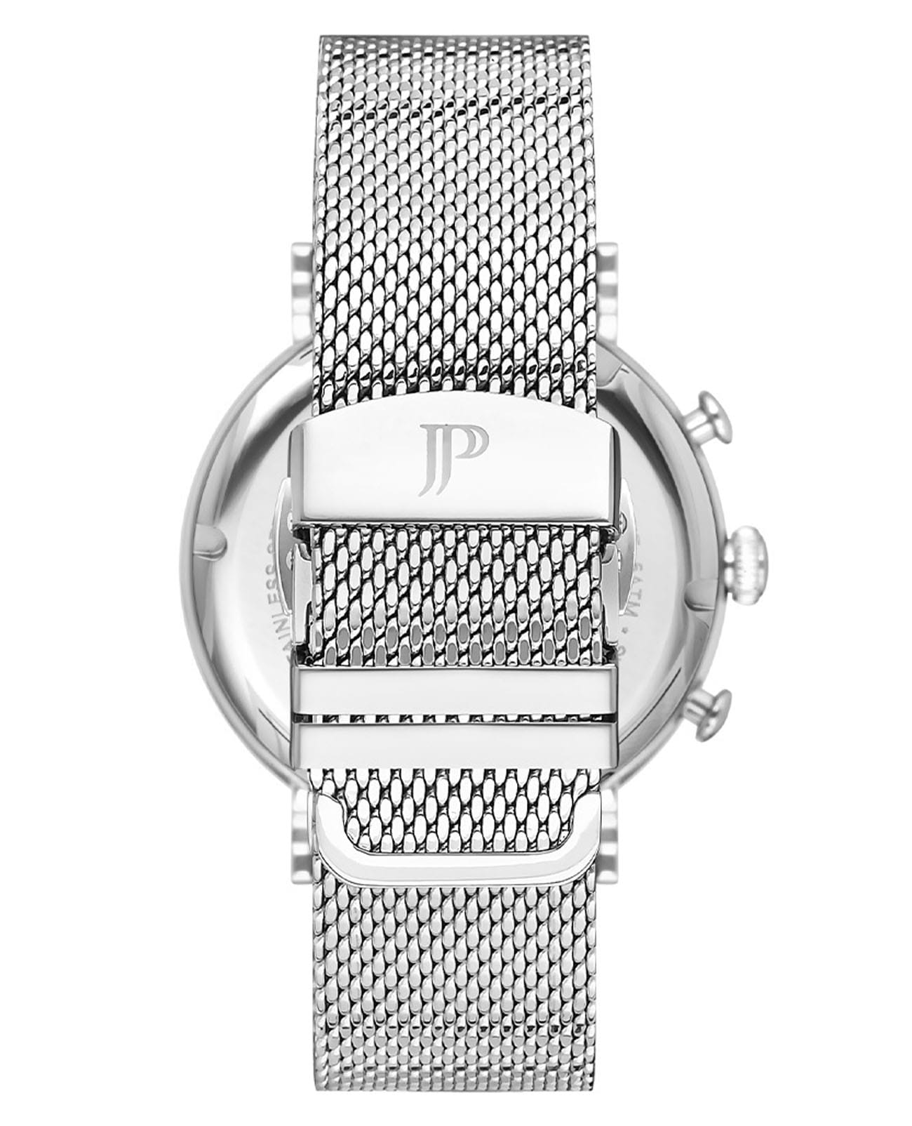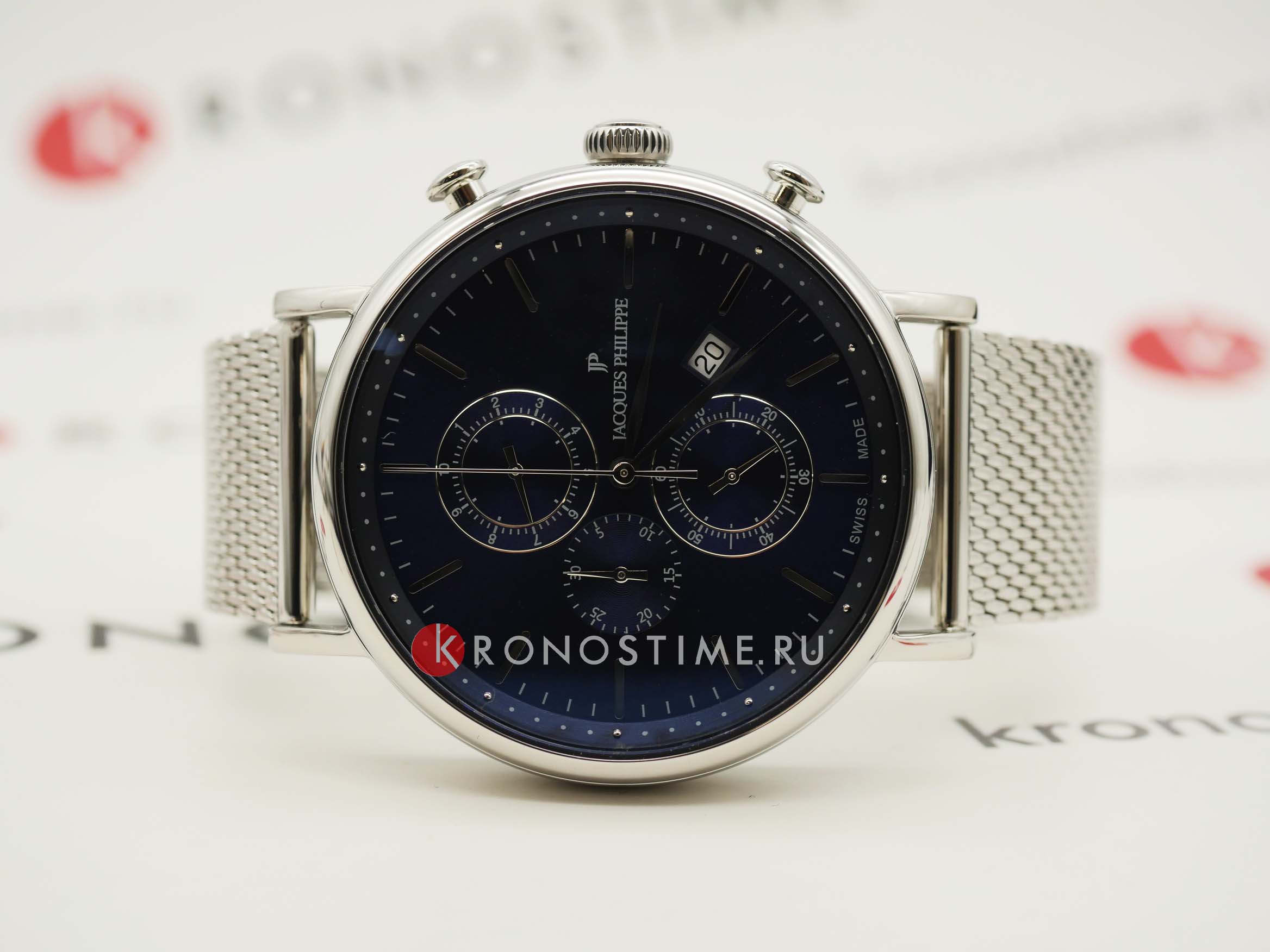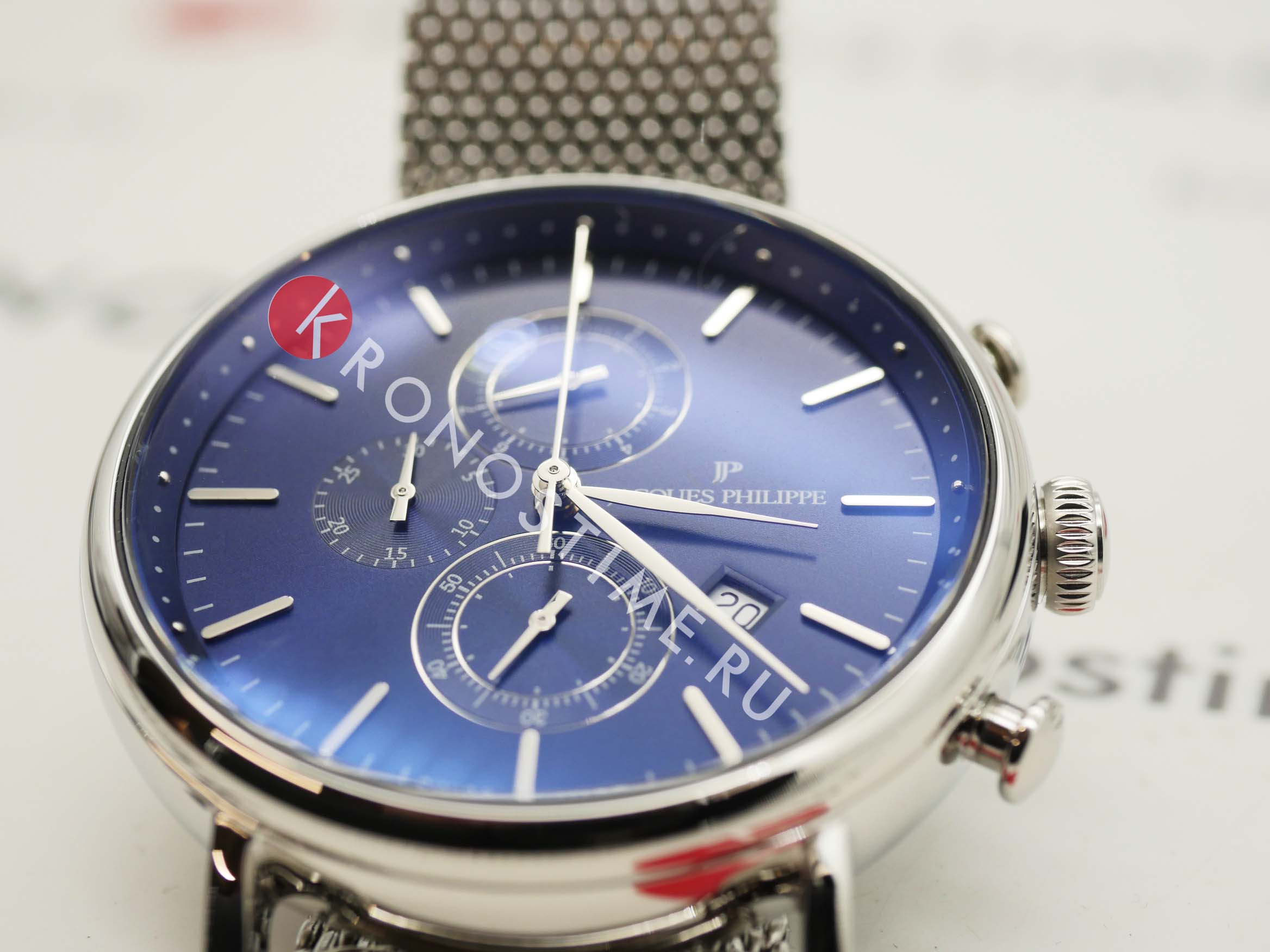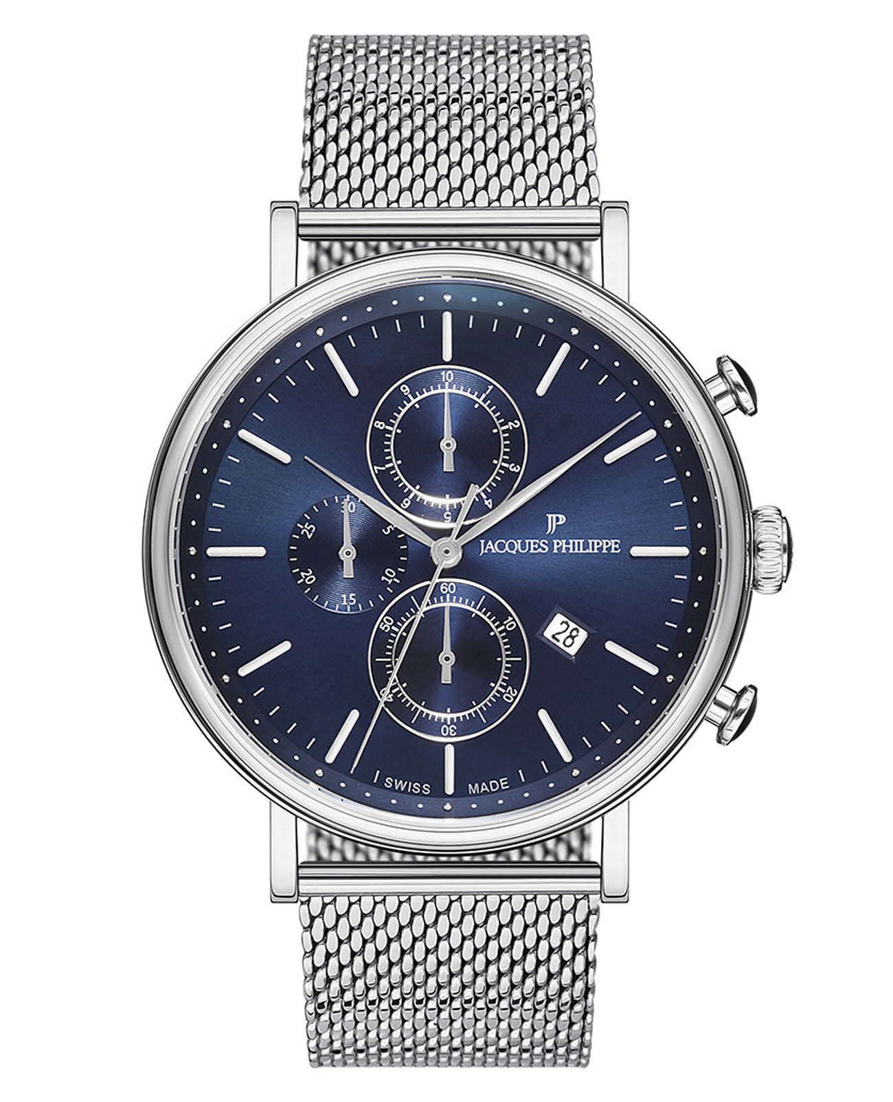 Швейцарские мужские часы-хронографХронографФункция позволяет измерять отрезки времени с особой точностью: часы, минуты, секунды. Верным признаком хронографа является наличие на циферблате 3 дополнительных окошек-счётчиков. Jacques Philippe Aviator JPQGC021236, кварцевый механизм с высокой точностью. Сапфировое стеклоСапфировое стеклоПрочный и надёжный материал из кристалла сапфира синтетического происхождения, характеризующийся особой твёрдостью и устойчивостью к царапинам и повреждениям. устойчивое к появлению царапин, обладающее высокой прозрачностью. Корпус часов изготовлен из нержавеющей стали. На циферблате три дополнительных индикатора. Окошко даты находится в положении 4 часов. Класс водозащиты: 50 метров, позволит защитить корпус от случайных брызг или капель дождя. Стальной браслет миланского плетения на раскладном замкеРаскладной замокДанный вариант застежки используется только на часах с металлическим браслетом. Отличительная особенность такого крепления в том, что длина браслета становится универсальной и вы можете самостоятельно отрегулировать нужный вам размер – застежка просто двигается по браслету часов..