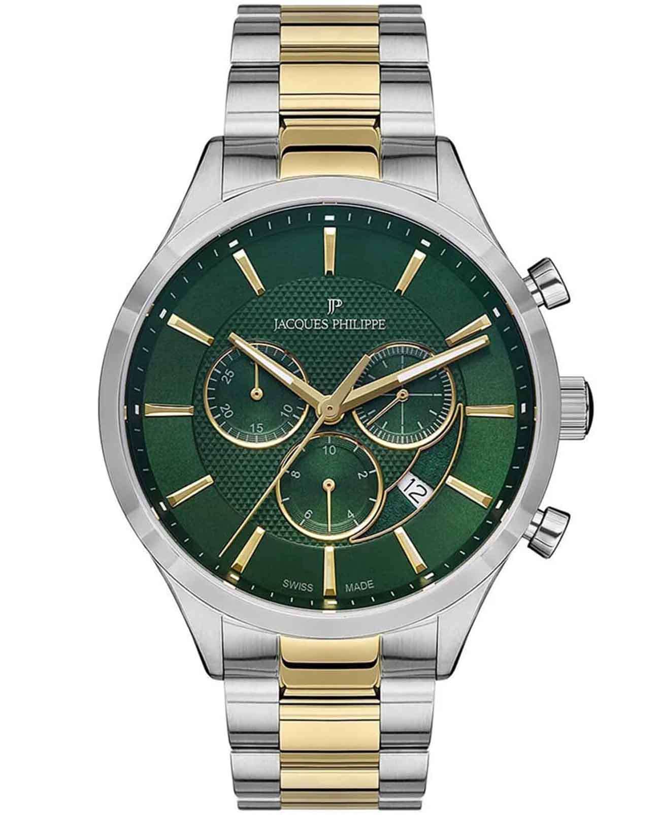 Часы Jacques Philippe Apollo JPQGC0313X8N — это гармоничное сочетание элегантного дизайна, современных швейцарских технологий и безупречного качества исполнения. Кварцевый механизм Ronda 5040.D.0001 обеспечивает точность хода. Модель оснащена точным кварцевым механизмом с функцией хронографаХронографФункция позволяет измерять отрезки времени с особой точностью: часы, минуты, секунды. Верным признаком хронографа является наличие на циферблате 3 дополнительных окошек-счётчиков. с секундомеромСекундомерСекундоме́р — прибор, способный измерять интервалы времени с точностью до долей секунды., что позволяет не только отслеживать время, но и использовать дополнительные возможности для активного образа жизни. Корпус диаметром 43 мм выполнен из прочной нержавеющей стали 316L, а сапфировое стеклоСапфировое стеклоПрочный и надёжный материал из кристалла сапфира синтетического происхождения, характеризующийся особой твёрдостью и устойчивостью к царапинам и повреждениям. надежно защищает зеленый циферблат от царапин и других повреждений. Окошко даты расположено между отметками 4 и 5 часов, что добавляет удобства в повседневном использовании. Для удобства использования в темное время суток предусмотрено люминесцентное покрытиеЛюминесцентное покрытиеПозволяет считывать показания времени в темноте. Производители наносят на стрелки, часовые индексы, безель или поверхность циферблата светонакопительный состав, дающий холодное свечение. стрелок. Браслет из нержавеющей стали с частичным золотистым PVD-покрытиемPVDУльтратонкое покрытие наносится в технике вакуумного напыления, сочетает в себе нитрид титана особой прочности со слоем золота или оксида хрома. Несёт в себе декоративную или защитную функцию. подчеркивает современный стиль изделия, а застежка «бабочка»Застёжка "бабочка"Такой вид застёжки дополняется предохранителями, помогающими избежать случайного раскрытия браслета. Обладают изящным исполнением. , раскладывающаяся при нажатии кнопок двойной блокировки, обеспечивает комфортное ношение и надежную фиксацию на запястье. Водозащита до 5 атмосфер позволяет не беспокоиться о случайных брызгах и дождевых каплях.