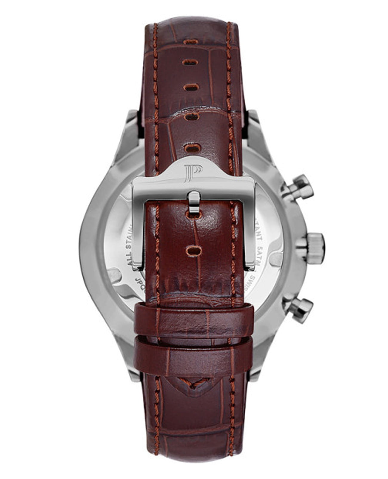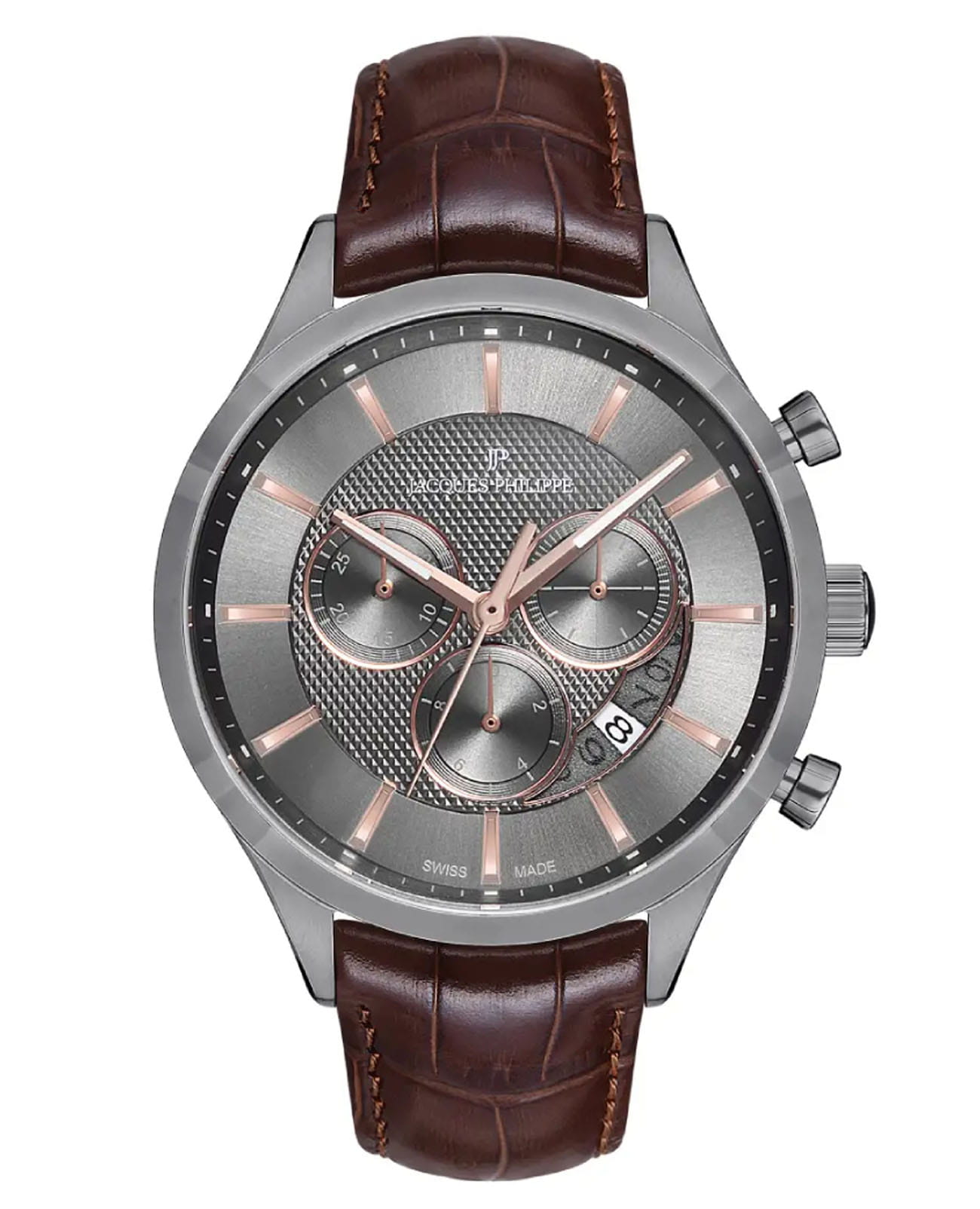 Швейцарские мужские часы-хронографХронографФункция позволяет измерять отрезки времени с особой точностью: часы, минуты, секунды. Верным признаком хронографа является наличие на циферблате 3 дополнительных окошек-счётчиков. с секундомеромСекундомерСекундоме́р — прибор, способный измерять интервалы времени с точностью до долей секунды. Jacques Philippe Gallant JPQGC038143, кварцевый механизм с высокой точностью. Сапфировое стеклоСапфировое стеклоПрочный и надёжный материал из кристалла сапфира синтетического происхождения, характеризующийся особой твёрдостью и устойчивостью к царапинам и повреждениям. устойчивое к появлению царапин, обладающее высокой прозрачностью. Корпус часов изготовлен из нержавеющей стали. На циферблате три дополнительных индикатора. Стрелки с люминесцентным покрытиемЛюминесцентное покрытиеПозволяет считывать показания времени в темноте. Производители наносят на стрелки, часовые индексы, безель или поверхность циферблата светонакопительный состав, дающий холодное свечение.. Окошко даты находится между 4 и 5 часами. Класс водозащиты: 50 метров, позволит защитить корпус от случайных брызг или капель дождя. Кожаный ремешок на стандартной застёжке.