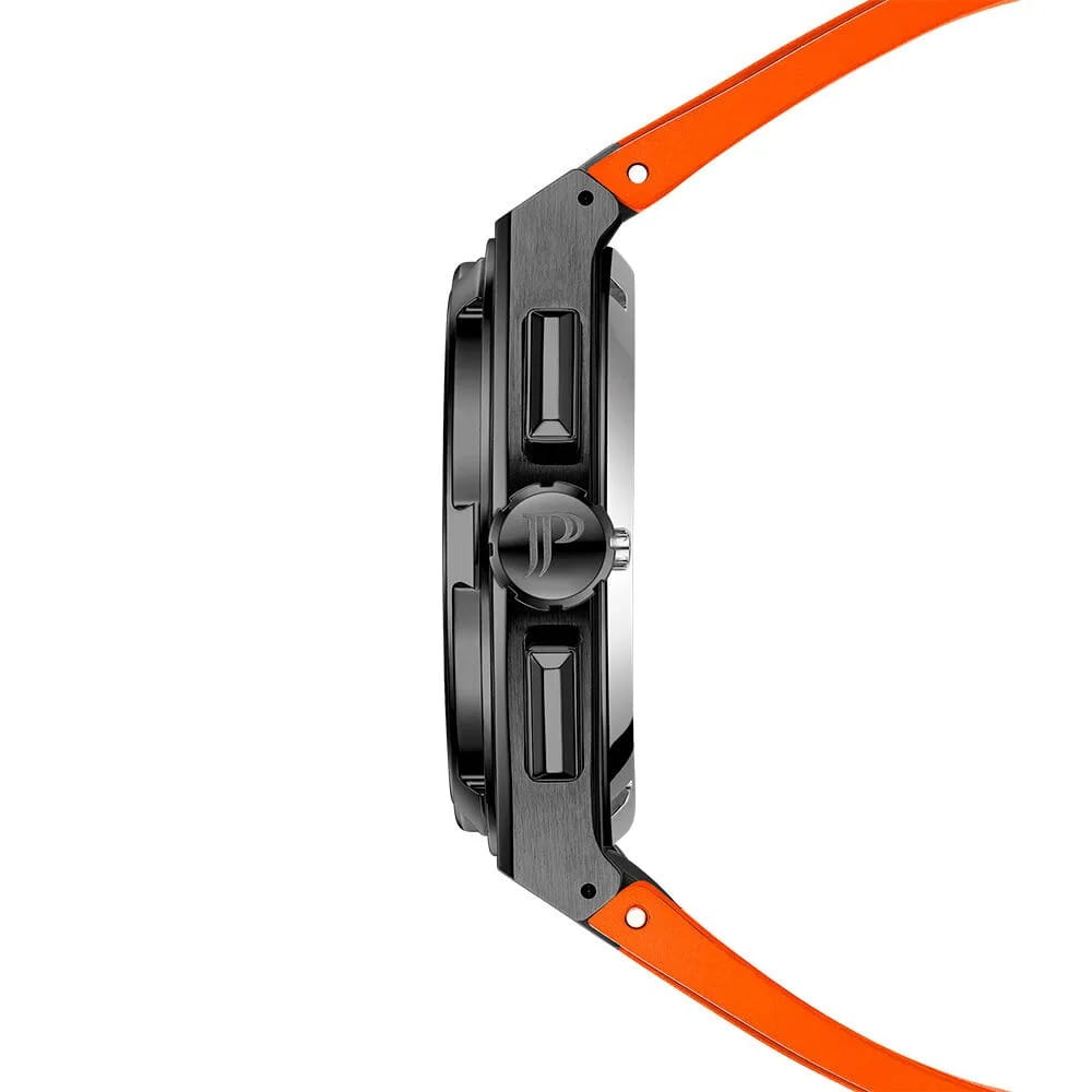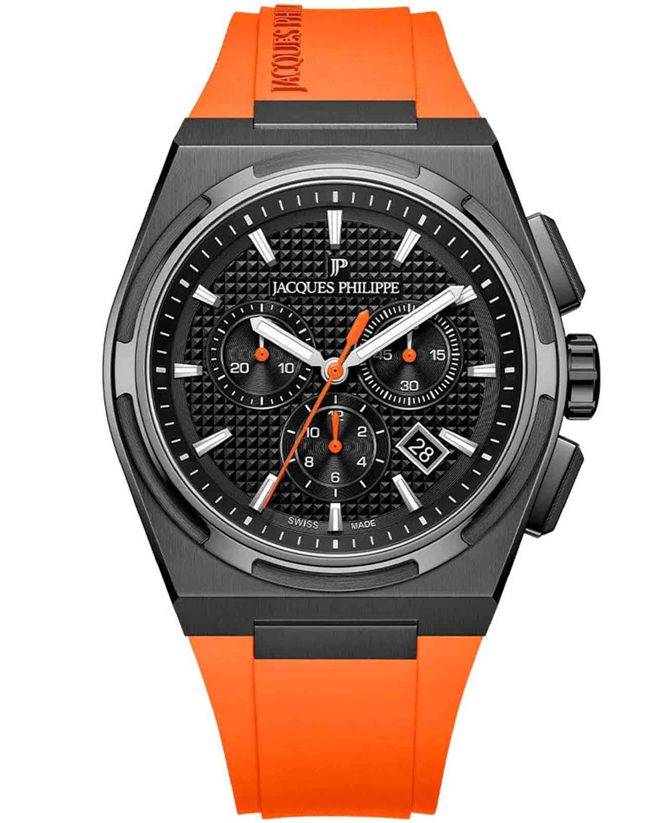 Часы-хронографаХронографФункция позволяет измерять отрезки времени с особой точностью: часы, минуты, секунды. Верным признаком хронографа является наличие на циферблате 3 дополнительных окошек-счётчиков. с секундомеромСекундомерСекундоме́р — прибор, способный измерять интервалы времени с точностью до долей секунды. Jacques Philippe JPQGC41841XO из коллекции Aurora — это гармоничное сочетание швейцарского качества, современного спортивного стиля и функциональности. Модель оснащена точным кварцевым механизмом калибра Ronda 5030.D, который гарантирует надежную работу и высокую точность хода. Корпус выполнен из прочной нержавеющей стали 316L с черным IP-покрытиемIP-покрытиеМетод ионного напыления. Демонстрирует повышенную устойчивость к истиранию, окислению и химическим веществам. Под воздействием высокого давления и температуры около 1500°C молекулы металла надёжно соединяются с частицами корпуса часов., устойчив к износу и сохраняет презентабельный вид даже при ежедневной эксплуатации. Сапфировое стеклоСапфировое стеклоПрочный и надёжный материал из кристалла сапфира синтетического происхождения, характеризующийся особой твёрдостью и устойчивостью к царапинам и повреждениям. с антибликовым покрытиемАнтибликовое покрытиеСлой оксида металла в 0,13-0,3 микрон, благодаря которому стекло часов не бликует и не отражает свет. Антибликовое покрытие уменьшает отражение света в 10 раз, обеспечивая отличную читаемость показателей циферблата. защищает черный циферблат от царапин и обеспечивает отличную читаемость информации при любом освещении. На циферблате расположены три дополнительных индикатора и окошко даты в положении «4 часа», а стрелки с люминесцентным покрытиемЛюминесцентное покрытиеПозволяет считывать показания времени в темноте. Производители наносят на стрелки, часовые индексы, безель или поверхность циферблата светонакопительный состав, дающий холодное свечение. позволяют легко определить время даже в темноте. Комфорт в носке обеспечивает силиконовый оранжевый ремешок шириной 27 мм, который плотно прилегает к запястью и отличается долговечностью. Водозащита 5 ATM позволяет не переживать за сохранность часов во время мытья рук или прогулок под дождём.