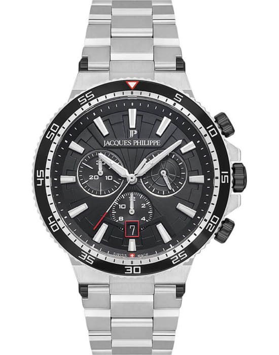 Швейцарские мужские часы-хронографХронографФункция позволяет измерять отрезки времени с особой точностью: часы, минуты, секунды. Верным признаком хронографа является наличие на циферблате 3 дополнительных окошек-счётчиков. Jacques Philippe Dynamo JPQGC447316SB, кварцевый механизм с высокой точностью. Сапфировое стеклоСапфировое стеклоПрочный и надёжный материал из кристалла сапфира синтетического происхождения, характеризующийся особой твёрдостью и устойчивостью к царапинам и повреждениям. устойчивое к появлению царапин, обладающее высокой прозрачностью. Корпус часов изготовлен из нержавеющей стали. На циферблате три дополнительных индикатора. Стрелки и метки с люминесцентным покрытиемЛюминесцентное покрытиеПозволяет считывать показания времени в темноте. Производители наносят на стрелки, часовые индексы, безель или поверхность циферблата светонакопительный состав, дающий холодное свечение.. Окошко даты находится в положении 6 часов. Класс водозащиты: 100 метров, позволит плавать, нырять и заниматься другими водными видами спорта. Стальной браслет на застёжке «бабочка» с кнопкамиЗастёжка "бабочка"Такой вид застёжки дополняется предохранителями, помогающими избежать случайного раскрытия браслета. Обладают изящным исполнением. .