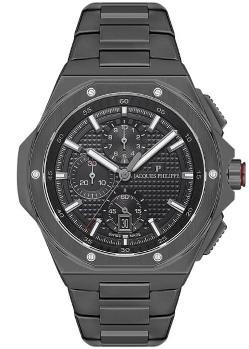 Швейцарские мужские часы-хронографХронографФункция позволяет измерять отрезки времени с особой точностью: часы, минуты, секунды. Верным признаком хронографа является наличие на циферблате 3 дополнительных окошек-счётчиков. с секундомеромСекундомерСекундоме́р — прибор, способный измерять интервалы времени с точностью до долей секунды. Jacques Philippe Esquire JPQGC488317, кварцевый механизм с высокой точностью. Сапфировое стеклоСапфировое стеклоПрочный и надёжный материал из кристалла сапфира синтетического происхождения, характеризующийся особой твёрдостью и устойчивостью к царапинам и повреждениям. устойчивое к появлению царапин, обладающее высокой прозрачностью. Корпус часов изготовлен из нержавеющей стали 316L с PVD-покрытиемPVDУльтратонкое покрытие наносится в технике вакуумного напыления, сочетает в себе нитрид титана особой прочности со слоем золота или оксида хрома. Несёт в себе декоративную или защитную функцию.. На циферблате три дополнительных индикатора. Стрелки и метки с люминесцентным покрытиемЛюминесцентное покрытиеПозволяет считывать показания времени в темноте. Производители наносят на стрелки, часовые индексы, безель или поверхность циферблата светонакопительный состав, дающий холодное свечение.. Шкала тахиметраТахиметрРазмеченная шкала, располагается на ободке или безеле часов. Тахиметр позволяет рассчитать скорость на определённом участке пути, расстояние измеряется в километрах или милях. на циферблате. Класс водозащиты: 50 метров, позволит защитить корпус от случайных брызг или капель дождя. Стальной браслет с PVD-покрытиемPVDУльтратонкое покрытие наносится в технике вакуумного напыления, сочетает в себе нитрид титана особой прочности со слоем золота или оксида хрома. Несёт в себе декоративную или защитную функцию. на застёжке «бабочка»Застёжка "бабочка"Такой вид застёжки дополняется предохранителями, помогающими избежать случайного раскрытия браслета. Обладают изящным исполнением. .