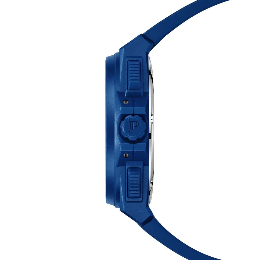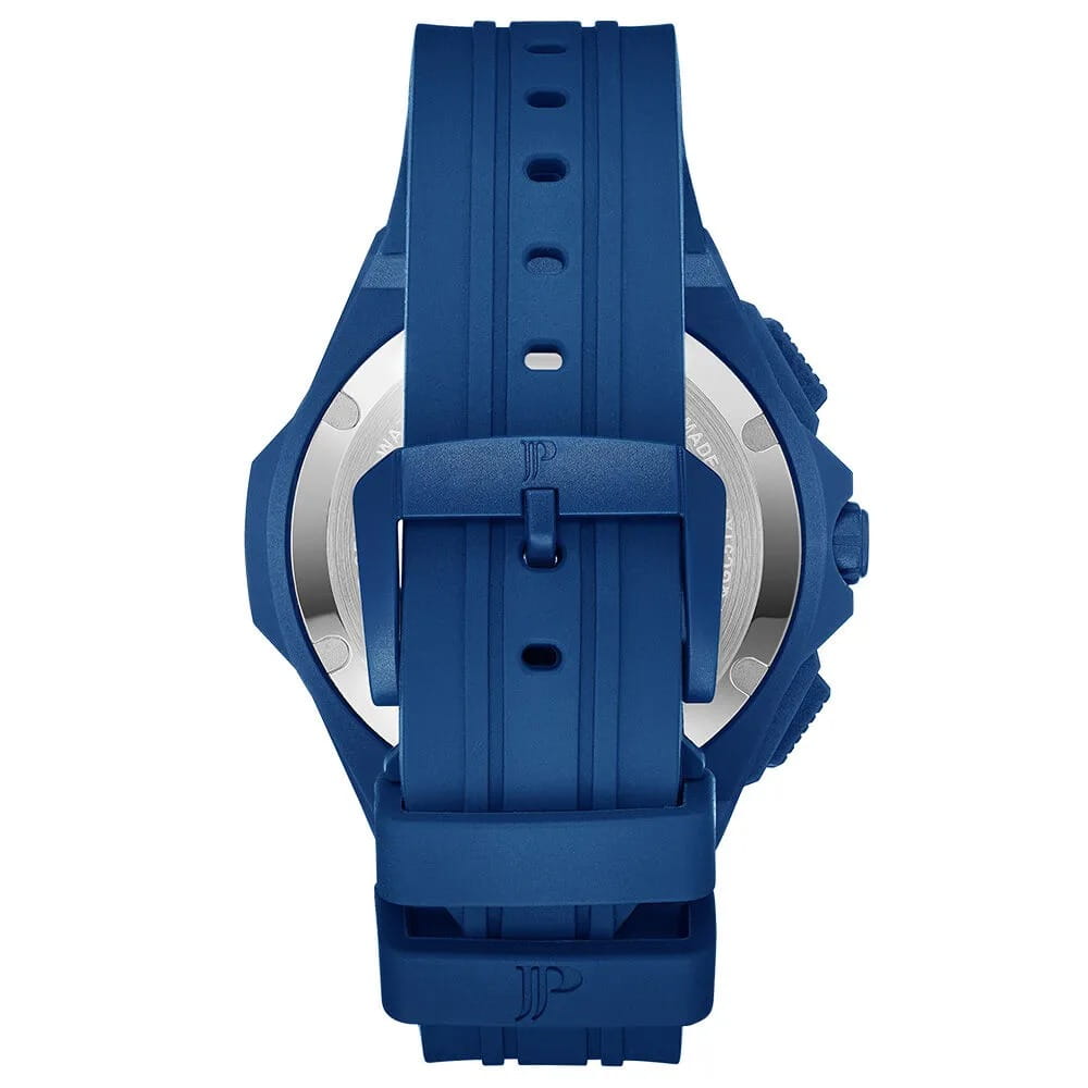 Часы Jacques Philippe JPQGC515432 из коллекции Militia — стильные швейцарские часы с функцией хронографаХронографФункция позволяет измерять отрезки времени с особой точностью: часы, минуты, секунды. Верным признаком хронографа является наличие на циферблате 3 дополнительных окошек-счётчиков. и секундомераСекундомерСекундоме́р — прибор, способный измерять интервалы времени с точностью до долей секунды., которые сочетают в себе элегантность и современный функционал. Модель оснащена надежным кварцевым механизмом, обеспечивающим высокую точность хода. Корпус выполнен из нержавеющей стали 316L с износостойким синим IP-покрытиемIP-покрытиеМетод ионного напыления. Демонстрирует повышенную устойчивость к истиранию, окислению и химическим веществам. Под воздействием высокого давления и температуры около 1500°C молекулы металла надёжно соединяются с частицами корпуса часов., диаметр корпуса составляет 48 мм, толщина — 12,5 мм. Сапфировое стеклоСапфировое стеклоПрочный и надёжный материал из кристалла сапфира синтетического происхождения, характеризующийся особой твёрдостью и устойчивостью к царапинам и повреждениям. защищает часы от царапин и сохраняет прозрачность даже при активном использовании. Синий циферблат дополнен тремя дополнительными индикаторами и окошком даты в положении 4 часа, а стрелки имеют люминесцентное покрытиеЛюминесцентное покрытиеПозволяет считывать показания времени в темноте. Производители наносят на стрелки, часовые индексы, безель или поверхность циферблата светонакопительный состав, дающий холодное свечение.  для удобства чтения времени в темноте. Силиконовый браслет шириной 26 мм и длиной 19 см надежно фиксируется на запястье стандартной застежкой и обеспечивает комфорт при носке. Водозащита 5 АТМ позволяет не снимать часы при мытье рук или прогулках под дождём.