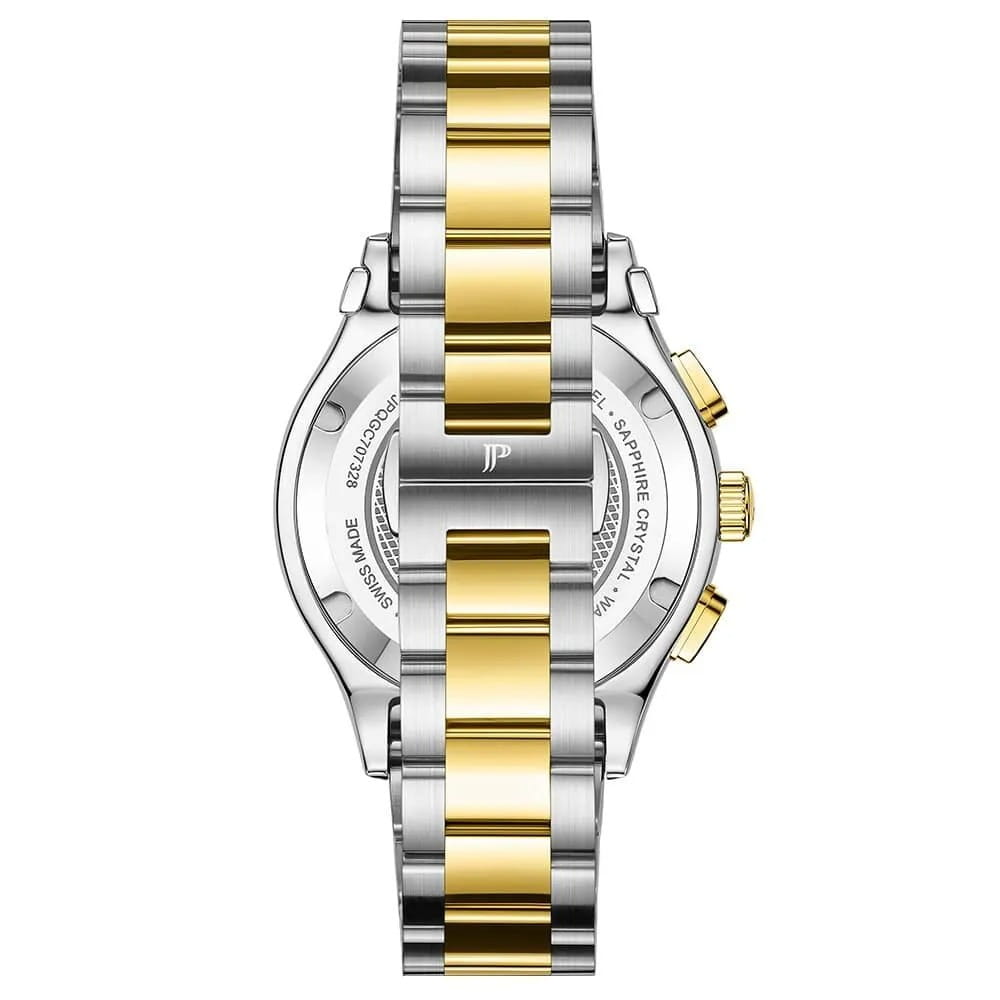 Jacques Philippe JPQGC707328 — швейцарские наручные часы, которые станут идеальным дополнением к образу современного мужчины, ценящего стиль и качество, это стильные швейцарские часы с функцией хронографаХронографФункция позволяет измерять отрезки времени с особой точностью: часы, минуты, секунды. Верным признаком хронографа является наличие на циферблате 3 дополнительных окошек-счётчиков. и секундомераСекундомерСекундоме́р — прибор, способный измерять интервалы времени с точностью до долей секунды.. Корпус и браслет выполнены из высокопрочной нержавеющей стали 316L, что подчеркивает статус владельца и гарантирует долговечность аксессуара. Классический дизайн с белым циферблатом гармонично сочетается с современными деталями: тахиметрическаяТахиметрРазмеченная шкала, располагается на ободке или безеле часов. Тахиметр позволяет рассчитать скорость на определённом участке пути, расстояние измеряется в километрах или милях. шкала на безелеБезельВнешний ободок, закрепляющий стекло. В спортивных часах так называется поворотное кольцо с делениями на циферблате, выполняет роль таймера – замеряет отрезки времени на шкале. Неподвижный безель – элемент декора. Однонаправленно вращающийся безель на дайверских часах позволяет фиксировать моменты погружения и выныривания на поверхность. с золотистым IP-покрытиемIP-покрытиеМетод ионного напыления. Демонстрирует повышенную устойчивость к истиранию, окислению и химическим веществам. Под воздействием высокого давления и температуры около 1500°C молекулы металла надёжно соединяются с частицами корпуса часов. добавляет функциональности, а окошко даты, расположенное на отметке «4 часа», обеспечивает дополнительное удобство. Сапфировое стеклоСапфировое стеклоПрочный и надёжный материал из кристалла сапфира синтетического происхождения, характеризующийся особой твёрдостью и устойчивостью к царапинам и повреждениям. надежно защищает часы от царапин и повреждений, сохраняя их безупречный внешний вид. Кварцевый механизм обеспечивает точный ход и не требует частого обслуживания. Водозащита до 10 атмосфер (100 метров) позволяет не снимать часы во время плавания. Стрелки имеют люминесцентное покрытиеЛюминесцентное покрытиеПозволяет считывать показания времени в темноте. Производители наносят на стрелки, часовые индексы, безель или поверхность циферблата светонакопительный состав, дающий холодное свечение. для удобства чтения времени в темноте. Стальной браслет с частичным золотистым IP-покрытиемIP-покрытиеМетод ионного напыления. Демонстрирует повышенную устойчивость к истиранию, окислению и химическим веществам. Под воздействием высокого давления и температуры около 1500°C молекулы металла надёжно соединяются с частицами корпуса часов. шириной 20 мм оснащен застежкой «бабочка»Застёжка "бабочка"Такой вид застёжки дополняется предохранителями, помогающими избежать случайного раскрытия браслета. Обладают изящным исполнением. для комфортного ношения в течение всего дня.