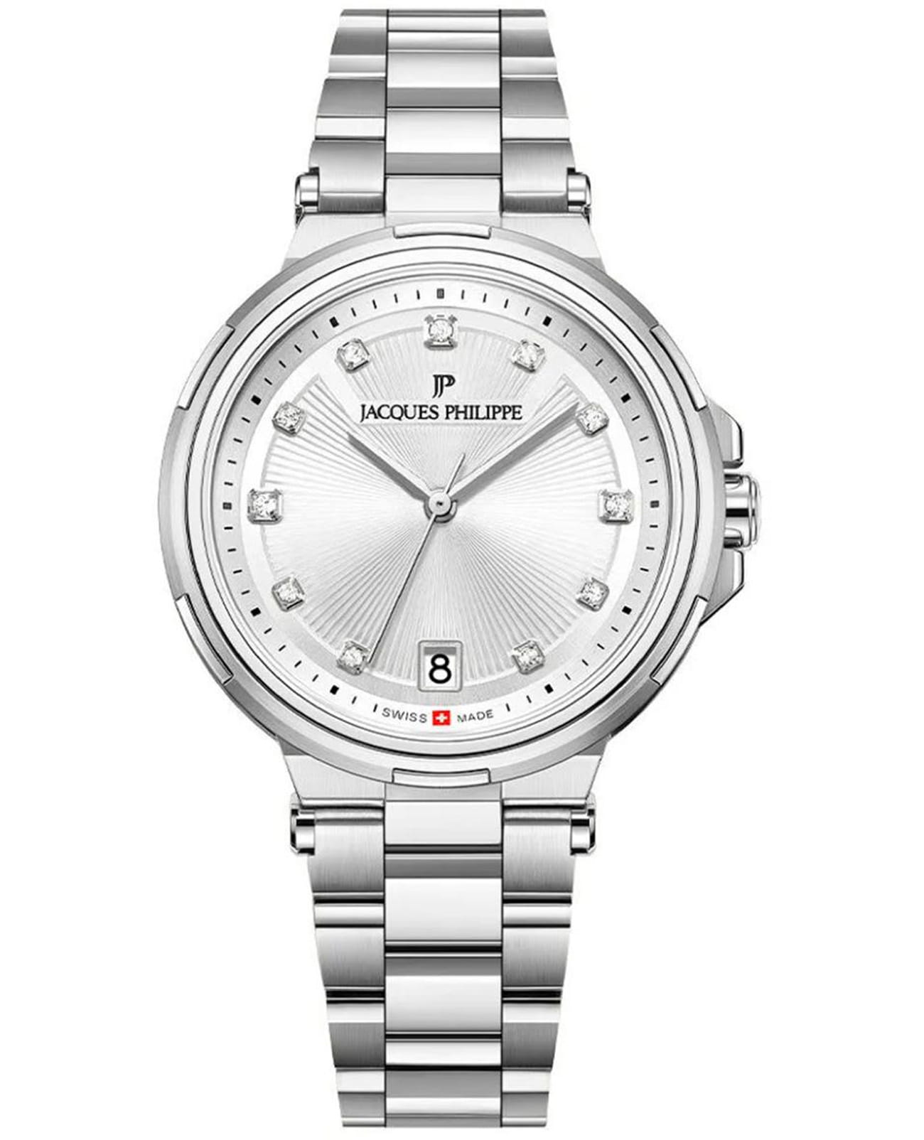 Часы Jacques Philippe JPQLS451326S — элегантные женские часы, сочетающие швейцарское качество и современный дизайн. Корпус диаметром 32 мм выполнен из нержавеющей стали, а серебристый циферблат защищён сапфировым стекломСапфировое стеклоПрочный и надёжный материал из кристалла сапфира синтетического происхождения, характеризующийся особой твёрдостью и устойчивостью к царапинам и повреждениям.. Циферблат инкрустирован кристаллами. Внутри установлен швейцарский кварцевый механизм, обеспечивающий высокую точность хода. Водозащита 50 метров (5 ATM) защищает часы от брызг и дождя. Браслет из нержавеющей стали с застёжкой бабочкаЗастёжка "бабочка"Такой вид застёжки дополняется предохранителями, помогающими избежать случайного раскрытия браслета. Обладают изящным исполнением. обеспечивает комфортное ношение и надёжную фиксацию на запястье. Эти часы идеально подойдут для тех, кто ценит сочетание элегантного дизайна и функциональности.