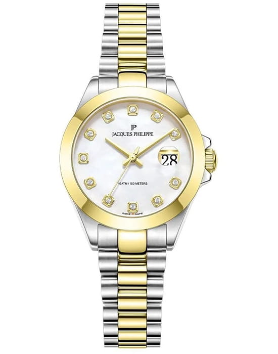Часы Jacques Philippe JPQLS737388YG из коллекции Infinitum — элегантные женские часы, сочетающие в себе швейцарское качество и современный дизайн. Корпус диаметром 30 мм выполнен из нержавеющей стали, а циферблат защищён сапфировым стекломСапфировое стеклоПрочный и надёжный материал из кристалла сапфира синтетического происхождения, характеризующийся особой твёрдостью и устойчивостью к царапинам и повреждениям.. БезельБезельВнешний ободок, закрепляющий стекло. В спортивных часах так называется поворотное кольцо с делениями на циферблате, выполняет роль таймера – замеряет отрезки времени на шкале. Неподвижный безель – элемент декора. Однонаправленно вращающийся безель на дайверских часах позволяет фиксировать моменты погружения и выныривания на поверхность. с PVD-покрытиемPVDУльтратонкое покрытие наносится в технике вакуумного напыления, сочетает в себе нитрид титана особой прочности со слоем золота или оксида хрома. Несёт в себе декоративную или защитную функцию.. Циферблат инкрустирован кристаллами. Внутри установлен швейцарский кварцевый механизм, обеспечивающий высокую точность хода. Водозащита 100 метров (10 ATM) позволяет использовать часы для плавания и других водных видов спорта. Браслет из нержавеющей стали с PVD-покрытиемPVDУльтратонкое покрытие наносится в технике вакуумного напыления, сочетает в себе нитрид титана особой прочности со слоем золота или оксида хрома. Несёт в себе декоративную или защитную функцию. и застёжкой бабочкаЗастёжка "бабочка"Такой вид застёжки дополняется предохранителями, помогающими избежать случайного раскрытия браслета. Обладают изящным исполнением. обеспечивает комфортное ношение и надёжную фиксацию на запястье. Эти часы идеально подойдут для тех, кто ценит сочетание классического стиля и современных технологий.