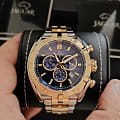 Мужские швейцарские часы-хронографХронографФункция позволяет измерять отрезки времени с особой точностью: часы, минуты, секунды. Верным признаком хронографа является наличие на циферблате 3 дополнительных окошек-счётчиков. Jaguar Executive J855/A. Кварцевый швейцарский калибр Ronda 5030d. Сапфировое стеклоСапфировое стеклоПрочный и надёжный материал из кристалла сапфира синтетического происхождения, характеризующийся особой твёрдостью и устойчивостью к царапинам и повреждениям. устойчивое к мелким механическим повреждениям. Корпус и браслет часов изготовлены из нержавеющей стали. Стрелки и метки с люминесцентным покрытиемЛюминесцентное покрытиеПозволяет считывать показания времени в темноте. Производители наносят на стрелки, часовые индексы, безель или поверхность циферблата светонакопительный состав, дающий холодное свечение.. Окошко даты находится в положении между «4» и «5 часами». Класс водозащиты: 100 метров, позволит плавать, нырять и заниматься другими водными видами спорта. Стальной браслет с частичным  PVD-покрытиемPVDУльтратонкое покрытие наносится в технике вакуумного напыления, сочетает в себе нитрид титана особой прочности со слоем золота или оксида хрома. Несёт в себе декоративную или защитную функцию. на раскладной застёжкеРаскладная застёжкаТакой тип застёжки используется только на браслетах из металла. Она никогда не раскрывается полностью, происходит разделение на 2 и более частей. Раскладывающая застёжка снизит вероятность потери часов к минимуму.. БезельБезельВнешний ободок, закрепляющий стекло. В спортивных часах так называется поворотное кольцо с делениями на циферблате, выполняет роль таймера – замеряет отрезки времени на шкале. Неподвижный безель – элемент декора. Однонаправленно вращающийся безель на дайверских часах позволяет фиксировать моменты погружения и выныривания на поверхность. с PVD-покрытиемPVDУльтратонкое покрытие наносится в технике вакуумного напыления, сочетает в себе нитрид титана особой прочности со слоем золота или оксида хрома. Несёт в себе декоративную или защитную функцию..