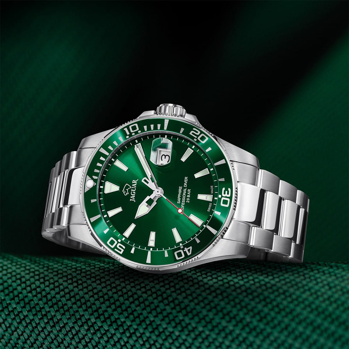 Мужские швейцарские часы Jaguar Executive Diver J860/B. Кварцевый швейцарский калибр Ronda 6003D. Сапфировое стеклоСапфировое стеклоПрочный и надёжный материал из кристалла сапфира синтетического происхождения, характеризующийся особой твёрдостью и устойчивостью к царапинам и повреждениям. устойчивое к мелким механическим повреждениям. Корпус и браслет часов изготовлены из нержавеющей стали. Стрелки и метки с люминесцентным покрытиемЛюминесцентное покрытиеПозволяет считывать показания времени в темноте. Производители наносят на стрелки, часовые индексы, безель или поверхность циферблата светонакопительный состав, дающий холодное свечение.. Окошко даты находится в положении 3 часа. Класс водозащиты: 200 метров, позволит плавать, нырять и заниматься другими водными видами спорта. Стальной браслет на раскладной застёжкеРаскладная застёжкаТакой тип застёжки используется только на браслетах из металла. Она никогда не раскрывается полностью, происходит разделение на 2 и более частей. Раскладывающая застёжка снизит вероятность потери часов к минимуму.. БезельБезельВнешний ободок, закрепляющий стекло. В спортивных часах так называется поворотное кольцо с делениями на циферблате, выполняет роль таймера – замеряет отрезки времени на шкале. Неподвижный безель – элемент декора. Однонаправленно вращающийся безель на дайверских часах позволяет фиксировать моменты погружения и выныривания на поверхность. с PVD-покрытиемPVDУльтратонкое покрытие наносится в технике вакуумного напыления, сочетает в себе нитрид титана особой прочности со слоем золота или оксида хрома. Несёт в себе декоративную или защитную функцию..
