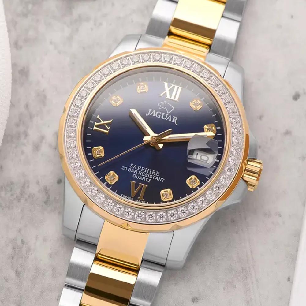 Женские швейцарские часы Jaguar Woman J893/2. Кварцевый швейцарский калибр Ronda 705. Сапфировое стеклоСапфировое стеклоПрочный и надёжный материал из кристалла сапфира синтетического происхождения, характеризующийся особой твёрдостью и устойчивостью к царапинам и повреждениям. устойчивое к мелким механическим повреждениям. Корпус и браслет часов изготовлены из нержавеющей стали, с безелем, инкрустированным цирконием. Стрелки с люминесцентным покрытиемЛюминесцентное покрытиеПозволяет считывать показания времени в темноте. Производители наносят на стрелки, часовые индексы, безель или поверхность циферблата светонакопительный состав, дающий холодное свечение.. Окошко даты находится в положении 3 часа. Класс водозащиты: 200 метров, позволит плавать, нырять и заниматься другими водными видами спорта. Стальной браслет с частичным PVD-покрытиемPVDУльтратонкое покрытие наносится в технике вакуумного напыления, сочетает в себе нитрид титана особой прочности со слоем золота или оксида хрома. Несёт в себе декоративную или защитную функцию. на раскладной застёжкеРаскладная застёжкаТакой тип застёжки используется только на браслетах из металла. Она никогда не раскрывается полностью, происходит разделение на 2 и более частей. Раскладывающая застёжка снизит вероятность потери часов к минимуму.. Циферблат украшен кристаллами в роли часовых индексов. БезельБезельВнешний ободок, закрепляющий стекло. В спортивных часах так называется поворотное кольцо с делениями на циферблате, выполняет роль таймера – замеряет отрезки времени на шкале. Неподвижный безель – элемент декора. Однонаправленно вращающийся безель на дайверских часах позволяет фиксировать моменты погружения и выныривания на поверхность. с PVD-покрытиемPVDУльтратонкое покрытие наносится в технике вакуумного напыления, сочетает в себе нитрид титана особой прочности со слоем золота или оксида хрома. Несёт в себе декоративную или защитную функцию. инкрустирован кристаллами.