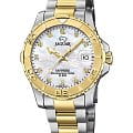 Женские швейцарские часы Jaguar Couple Diver J896/3. Кварцевый швейцарский калибр Ronda 705. Сапфировое стеклоСапфировое стеклоПрочный и надёжный материал из кристалла сапфира синтетического происхождения, характеризующийся особой твёрдостью и устойчивостью к царапинам и повреждениям. устойчивое к мелким механическим повреждениям. Корпус часов изготовлен из нержавеющей стали. Стрелки и метки с люминесцентным покрытиемЛюминесцентное покрытиеПозволяет считывать показания времени в темноте. Производители наносят на стрелки, часовые индексы, безель или поверхность циферблата светонакопительный состав, дающий холодное свечение.. Окошко даты находится в положении 3 часа. Класс водозащиты: 200 метров, позволит плавать, нырять и заниматься другими водными видами спорта. Стальной браслет с частичным PVD-покрытиемPVDУльтратонкое покрытие наносится в технике вакуумного напыления, сочетает в себе нитрид титана особой прочности со слоем золота или оксида хрома. Несёт в себе декоративную или защитную функцию. на раскладной застёжкеРаскладная застёжкаТакой тип застёжки используется только на браслетах из металла. Она никогда не раскрывается полностью, происходит разделение на 2 и более частей. Раскладывающая застёжка снизит вероятность потери часов к минимуму.. Циферблат украшен кристаллами в роли часовых индексов. БезельБезельВнешний ободок, закрепляющий стекло. В спортивных часах так называется поворотное кольцо с делениями на циферблате, выполняет роль таймера – замеряет отрезки времени на шкале. Неподвижный безель – элемент декора. Однонаправленно вращающийся безель на дайверских часах позволяет фиксировать моменты погружения и выныривания на поверхность. с PVD-покрытиемPVDУльтратонкое покрытие наносится в технике вакуумного напыления, сочетает в себе нитрид титана особой прочности со слоем золота или оксида хрома. Несёт в себе декоративную или защитную функцию..