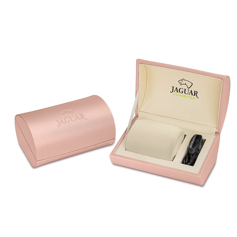 Женские швейцарские часы Jaguar Connected Lady J980/6. Сапфировое стеклоСапфировое стеклоПрочный и надёжный материал из кристалла сапфира синтетического происхождения, характеризующийся особой твёрдостью и устойчивостью к царапинам и повреждениям. устойчивое к мелким механическим повреждениям. Корпус и браслет часов изготовлены из нержавеющей стали. Стрелки и метки с люминесцентным покрытиемЛюминесцентное покрытиеПозволяет считывать показания времени в темноте. Производители наносят на стрелки, часовые индексы, безель или поверхность циферблата светонакопительный состав, дающий холодное свечение.. Класс водозащиты: 50 метров, позволит защитить корпус от случайных брызг или капель дождя. БезельБезельВнешний ободок, закрепляющий стекло. В спортивных часах так называется поворотное кольцо с делениями на циферблате, выполняет роль таймера – замеряет отрезки времени на шкале. Неподвижный безель – элемент декора. Однонаправленно вращающийся безель на дайверских часах позволяет фиксировать моменты погружения и выныривания на поверхность. и циферблат инкрустированный цирконием. Стальной браслет на раскладной застёжкеРаскладная застёжкаТакой тип застёжки используется только на браслетах из металла. Она никогда не раскрывается полностью, происходит разделение на 2 и более частей. Раскладывающая застёжка снизит вероятность потери часов к минимуму.. За точный ход работы часов, из коллекции Connected, отвечает кварцевый гибридный механизм швейцарского производства со Смарт-Модулем. Данный тип механизма обеспечивает возможность подключить часы к телефону через Bluetooth и управлять большим рядом дополнительных функций на выбор с помошью приложения Jaguar. Дополнительные функции: отображение даты и дня недели, секундомер, таймер, GMT, шагомер, поиск телефона, включение/выключение звука телефона при входящих вызовах, переключение музыки, вибро-уведомления.