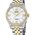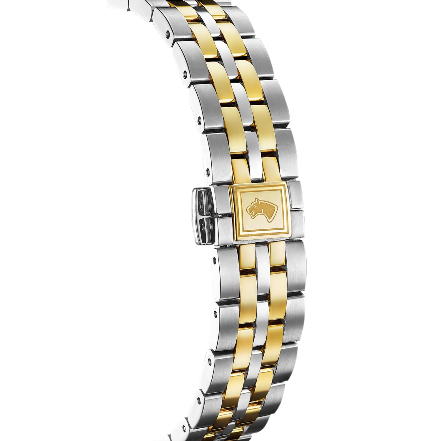 Женские швейцарские часы Jaguar Automatic Woman J998/1, механизм — автоподзавод. В часах с автоподзаводом заводная головка практически не используется, что исключает истирание ее материала и материала корпуса. Сапфировое стеклоСапфировое стеклоПрочный и надёжный материал из кристалла сапфира синтетического происхождения, характеризующийся особой твёрдостью и устойчивостью к царапинам и повреждениям. устойчивое к мелким механическим повреждениям. Корпус и браслет часов изготовлены из нержавеющей стали. Окошко даты находится в положении 6 часов. Класс водозащиты: 50 метров, позволит защитить корпус от случайных брызг или капель дождя. Стальной браслет с частичным PVD-покрытиемPVDУльтратонкое покрытие наносится в технике вакуумного напыления, сочетает в себе нитрид титана особой прочности со слоем золота или оксида хрома. Несёт в себе декоративную или защитную функцию. на застёжке-бабочке с кнопкамиЗастёжка "бабочка"Такой вид застёжки дополняется предохранителями, помогающими избежать случайного раскрытия браслета. Обладают изящным исполнением. . БезельБезельВнешний ободок, закрепляющий стекло. В спортивных часах так называется поворотное кольцо с делениями на циферблате, выполняет роль таймера – замеряет отрезки времени на шкале. Неподвижный безель – элемент декора. Однонаправленно вращающийся безель на дайверских часах позволяет фиксировать моменты погружения и выныривания на поверхность. с PVD-покрытиемPVDУльтратонкое покрытие наносится в технике вакуумного напыления, сочетает в себе нитрид титана особой прочности со слоем золота или оксида хрома. Несёт в себе декоративную или защитную функцию. инкрустирован цирконием.