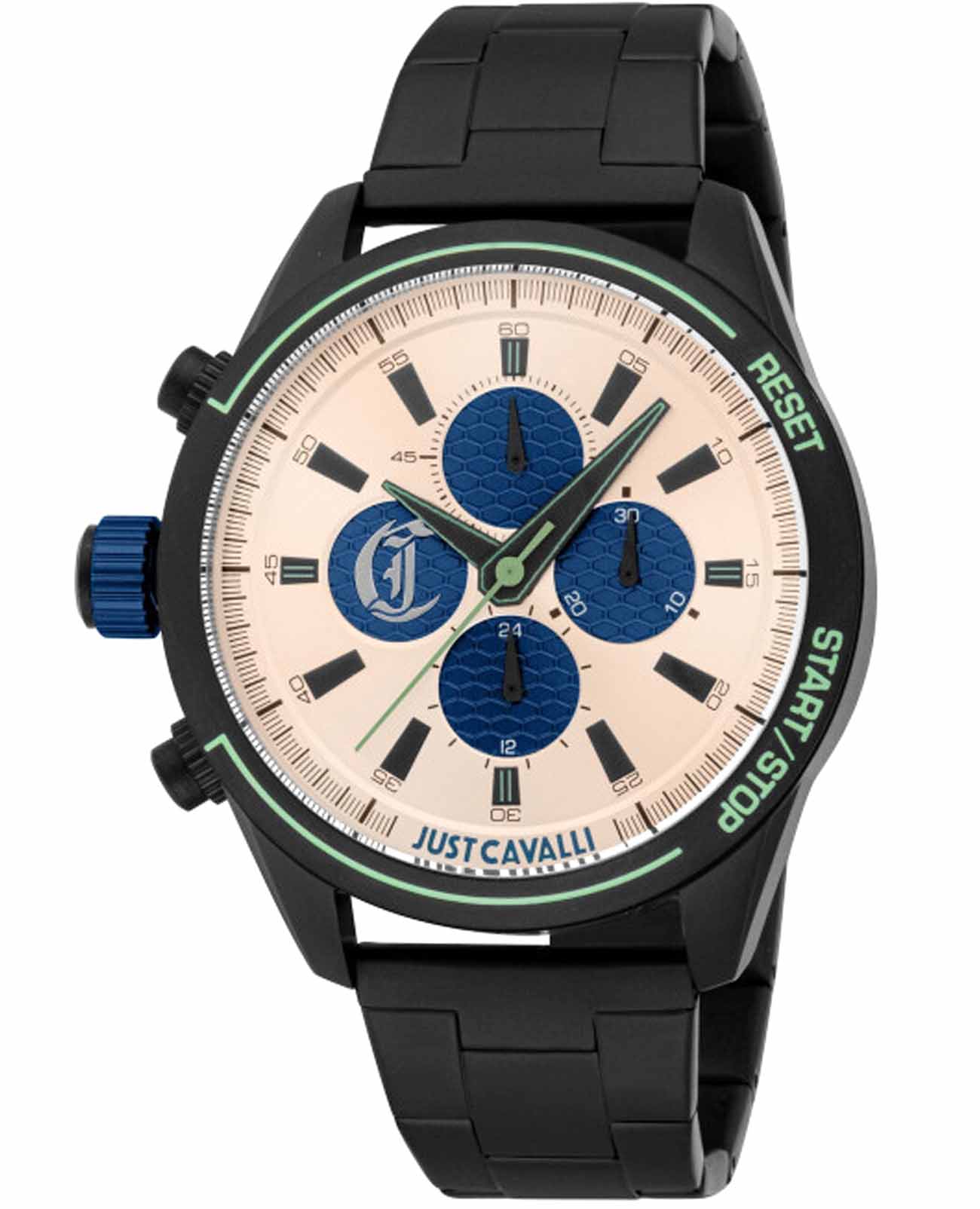 JUST CAVALLI JC1G347M0075 — стильные итальянские часы с функцией хронографаХронографФункция позволяет измерять отрезки времени с особой точностью: часы, минуты, секунды. Верным признаком хронографа является наличие на циферблате 3 дополнительных окошек-счётчиков., которые сочетают в себе элегантность и современный функционал. Круглый корпус диаметром 45 мм и толщиной 12 мм выполнен из нержавеющей стали с PVD-покрытиемPVDУльтратонкое покрытие наносится в технике вакуумного напыления, сочетает в себе нитрид титана особой прочности со слоем золота или оксида хрома. Несёт в себе декоративную или защитную функцию., что придает модели выразительный внешний вид и надежную защиту от внешних воздействий. Часы оснащены кварцевым механизмом. Минеральное стеклоМинеральное стеклоМинеральное стекло представляет собой искусственно выращенный минерал кварца. Такое стекло отличается особой устойчивостью к повреждениям и царапинам. Уступает по некоторым качествам сапфировому стеклу. защищает часы от царапин, а водозащита 100 метров позволяет не снимать их во время плавания и занятий спортом. Стальной браслет на раскладной застёжкеРаскладная застёжкаТакой тип застёжки используется только на браслетах из металла. Она никогда не раскрывается полностью, происходит разделение на 2 и более частей. Раскладывающая застёжка снизит вероятность потери часов к минимуму. обеспечивает комфортное ношение.  Эта модель — идеальный выбор для тех, кто ценит современные технологии , классический стиль и качество.