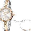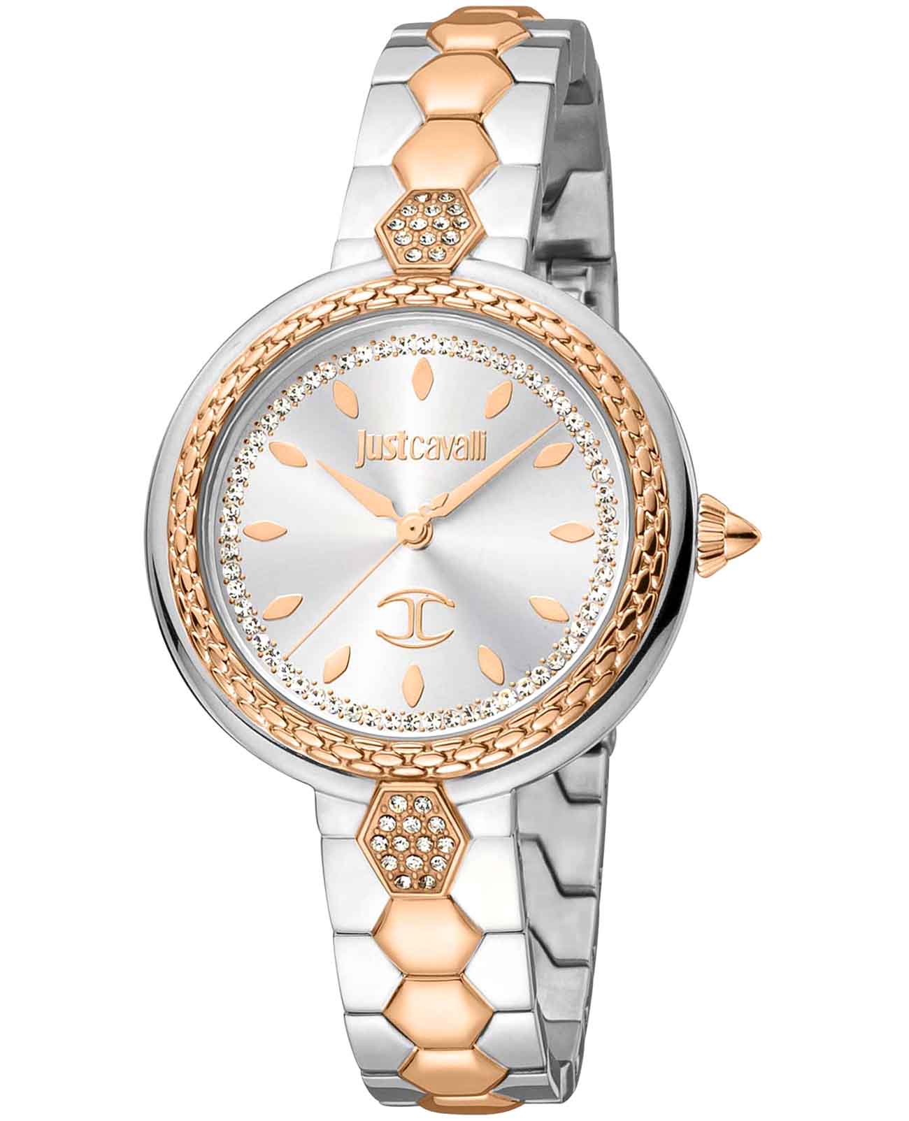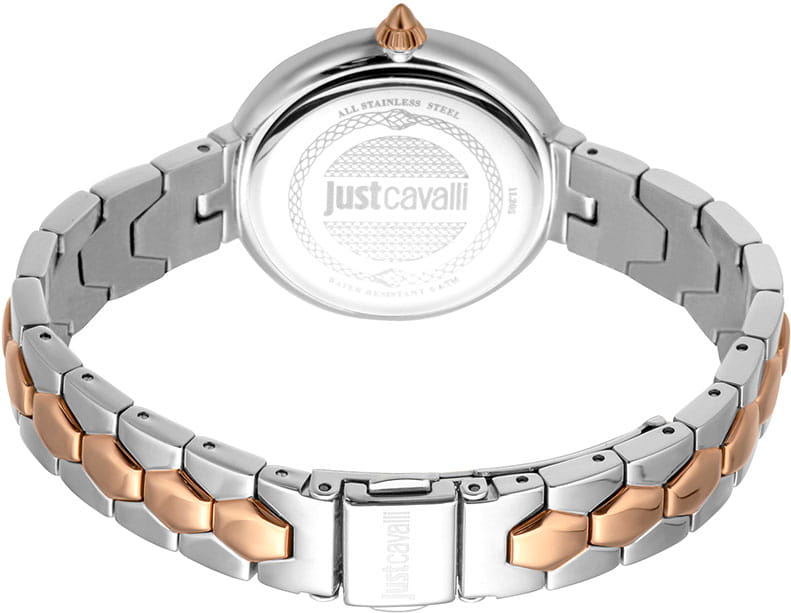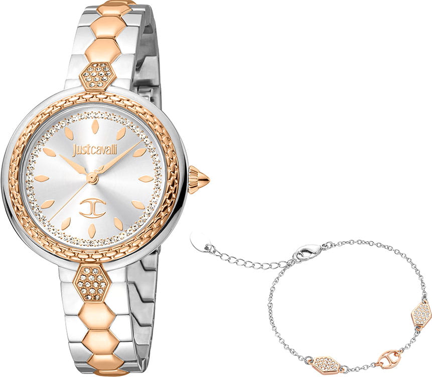 JUST CAVALLI JC1L205M0105_SET — это не просто часы, это заявление о стиле, воплощение дерзости и элегантности. Этот комплект, включающий в себя элегантные часы и стильный браслет, создан для женщины, которая не боится быть в центре внимания. Яркий дизайн, вдохновленный дикой природой и итальянской модой, делает этот аксессуар идеальным дополнением к любому образу. Корпус диаметром 34 мм выполнен из нержавеющей стали, что придает модели выразительный внешний вид и надежную защиту от внешних воздействий. Стальной браслет на раскладной застёжкеРаскладная застёжкаТакой тип застёжки используется только на браслетах из металла. Она никогда не раскрывается полностью, происходит разделение на 2 и более частей. Раскладывающая застёжка снизит вероятность потери часов к минимуму.. БезельБезельВнешний ободок, закрепляющий стекло. В спортивных часах так называется поворотное кольцо с делениями на циферблате, выполняет роль таймера – замеряет отрезки времени на шкале. Неподвижный безель – элемент декора. Однонаправленно вращающийся безель на дайверских часах позволяет фиксировать моменты погружения и выныривания на поверхность. с PVD-покрытиемPVDУльтратонкое покрытие наносится в технике вакуумного напыления, сочетает в себе нитрид титана особой прочности со слоем золота или оксида хрома. Несёт в себе декоративную или защитную функцию.. Часы оснащены кварцевым механизмом, циферблат украшен чешскими кристаллами. Граненая заводная головка. Задняя крышка с гравировкой. Минеральное стеклоМинеральное стеклоМинеральное стекло представляет собой искусственно выращенный минерал кварца. Такое стекло отличается особой устойчивостью к повреждениям и царапинам. Уступает по некоторым качествам сапфировому стеклу. защищает часы от царапин, а водозащита 50 метров позволяет позволяет не беспокоиться о случайных брызгах. В наборе стальной браслет-цепочка JCGW0198BR на руку.