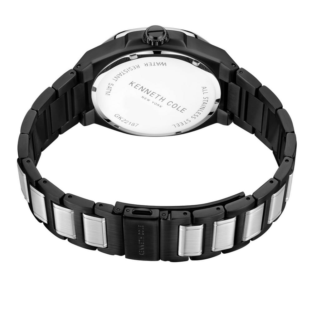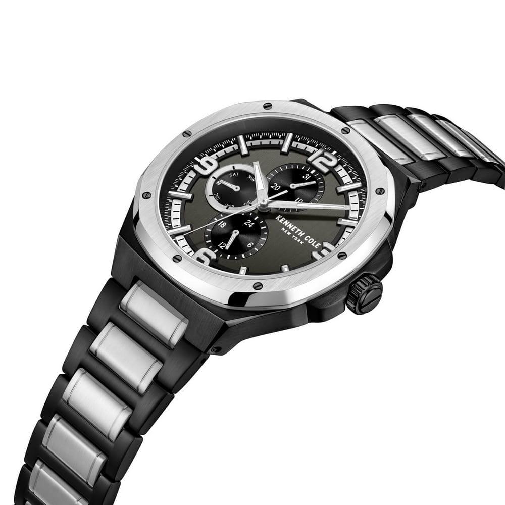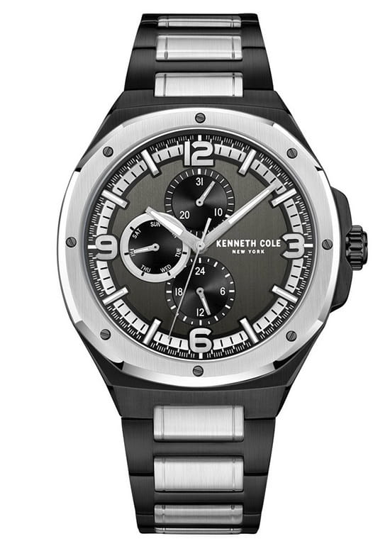Мужские кварцевые часы-хронографХронографФункция позволяет измерять отрезки времени с особой точностью: часы, минуты, секунды. Верным признаком хронографа является наличие на циферблате 3 дополнительных окошек-счётчиков. с секундомеромСекундомерСекундоме́р — прибор, способный измерять интервалы времени с точностью до долей секунды. Kenneth Cole Dress Sport KCWGK2218703, кварцевый механизм с высокой точностью. Минеральное стеклоМинеральное стеклоМинеральное стекло представляет собой искусственно выращенный минерал кварца. Такое стекло отличается особой устойчивостью к повреждениям и царапинам. Уступает по некоторым качествам сапфировому стеклу. устойчивое к появлению царапин, обладающее высокой прозрачностью. Класс водозащиты: 30 метров, позволит защитить корпус от случайных брызг или капель дождя. Корпус и безельБезельВнешний ободок, закрепляющий стекло. В спортивных часах так называется поворотное кольцо с делениями на циферблате, выполняет роль таймера – замеряет отрезки времени на шкале. Неподвижный безель – элемент декора. Однонаправленно вращающийся безель на дайверских часах позволяет фиксировать моменты погружения и выныривания на поверхность. изготовлен из стали с IP-покрытиемIP-покрытиеМетод ионного напыления. Демонстрирует повышенную устойчивость к истиранию, окислению и химическим веществам. Под воздействием высокого давления и температуры около 1500°C молекулы металла надёжно соединяются с частицами корпуса часов.. Индикация даты и дня недели. Стрелки и метки с люминесцентным покрытиемЛюминесцентное покрытиеПозволяет считывать показания времени в темноте. Производители наносят на стрелки, часовые индексы, безель или поверхность циферблата светонакопительный состав, дающий холодное свечение.. Браслет из стали с частичным IP-покрытиемIP-покрытиеМетод ионного напыления. Демонстрирует повышенную устойчивость к истиранию, окислению и химическим веществам. Под воздействием высокого давления и температуры около 1500°C молекулы металла надёжно соединяются с частицами корпуса часов. и с раскладной застёжкойРаскладная застёжкаТакой тип застёжки используется только на браслетах из металла. Она никогда не раскрывается полностью, происходит разделение на 2 и более частей. Раскладывающая застёжка снизит вероятность потери часов к минимуму..