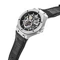 Kenneth Cole KCWGX0080804 — мужская механическая модель с мощным дизайном и открытым скелетонизированным циферблатом. Круглый корпус из нержавеющей стали выполнен и декорирован винтами на безелеБезельВнешний ободок, закрепляющий стекло. В спортивных часах так называется поворотное кольцо с делениями на циферблате, выполняет роль таймера – замеряет отрезки времени на шкале. Неподвижный безель – элемент декора. Однонаправленно вращающийся безель на дайверских часах позволяет фиксировать моменты погружения и выныривания на поверхность., что подчёркивает индустриальный характер часов. Циферблат открывает вид на работу механизма, создавая эффект глубины и технической изысканности. Метки и стрелки покрыты люминесцентным покрытиемЛюминесцентное покрытиеПозволяет считывать показания времени в темноте. Производители наносят на стрелки, часовые индексы, безель или поверхность циферблата светонакопительный состав, дающий холодное свечение., обеспечивающим читаемость даже в условиях слабого освещения. Защитную функцию выполняет минеральное стеклоМинеральное стеклоМинеральное стекло представляет собой искусственно выращенный минерал кварца. Такое стекло отличается особой устойчивостью к повреждениям и царапинам. Уступает по некоторым качествам сапфировому стеклу., стойкое к повседневным повреждениям. Часы комплектуются кожаным ремешком с классической застёжкой, который обеспечивает комфорт и стильное сочетание с массивным корпусом. Модель объединяет выразительный скелетон-дизайн и современный характер, становясь эффектным акцентом в мужском образе.