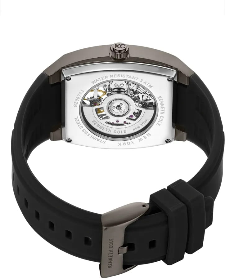 Kenneth Cole KCWGZ0077302 — мужская автоматическая модель с выразительным современным стилем и скелетонизированным дизайном. Корпус выполнен из нержавеющей стали с PVD-покрытиемPVDУльтратонкое покрытие наносится в технике вакуумного напыления, сочетает в себе нитрид титана особой прочности со слоем золота или оксида хрома. Несёт в себе декоративную или защитную функцию. и подчёркивает архитектурный облик часов. Циферблат с открытым механизмом позволяет рассмотреть работу автоматического калибра, акцентируя внимание на его деталях. Метки и стрелки покрыты люминесцентным покрытиемЛюминесцентное покрытиеПозволяет считывать показания времени в темноте. Производители наносят на стрелки, часовые индексы, безель или поверхность циферблата светонакопительный состав, дающий холодное свечение., что обеспечивает читаемость в условиях слабого освещения. Защитную функцию выполняет минеральное стеклоМинеральное стеклоМинеральное стекло представляет собой искусственно выращенный минерал кварца. Такое стекло отличается особой устойчивостью к повреждениям и царапинам. Уступает по некоторым качествам сапфировому стеклу., устойчивое к повседневным повреждениям. Часы дополнены силиконовым ремешком с классической застёжкой, создающим удобную посадку и комфорт в носке. Модель объединяет техническую эстетику скелетона и современный характер, подчёркивая индивидуальность владельца.