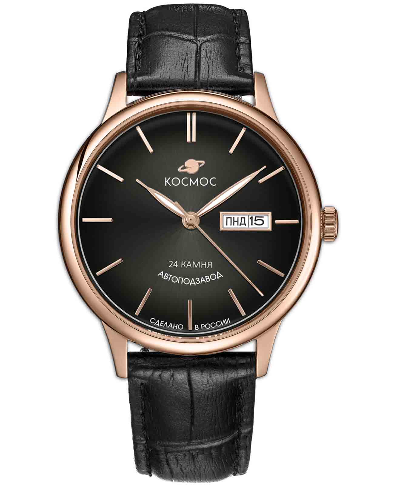 Российские мужские механические часы Космос K 043.41.31 из коллекции Юпитер с автоподзаводом оснащены корпусом из нержавеющей стали 316L с PVD-покрытиемPVDУльтратонкое покрытие наносится в технике вакуумного напыления, сочетает в себе нитрид титана особой прочности со слоем золота или оксида хрома. Несёт в себе декоративную или защитную функцию. диаметром 41 мм и толщиной 14 мм. Циферблат защищен минеральным стекломМинеральное стеклоМинеральное стекло представляет собой искусственно выращенный минерал кварца. Такое стекло отличается особой устойчивостью к повреждениям и царапинам. Уступает по некоторым качествам сапфировому стеклу., выпуклым с обеих сторон. Циферблат дополнен функциями отображения даты и дня недели. Прозрачная задняя крышка позволяет наблюдать за работой механизма. Заводная головка украшена логотипом бренда в виде стилизованного изображения планеты. Часы имеют водонепроницаемость 50 метров, позволит защитить корпус от случайных брызг или капель дождя. Модель комплектуется кожаным ремешком на стандартной застежке. Специальные крепежи позволяют легко заменить браслет на часах самостоятельно. Прочный корпус и надежный механизм делают эти часы универсальным аксессуаром для повседневного использования. Уникальный дизайн и высокое качество материалов подчеркивают индивидуальность владельца.