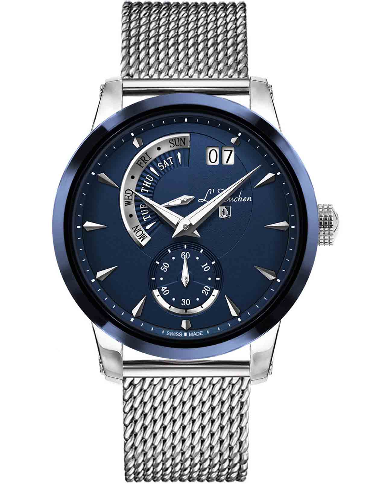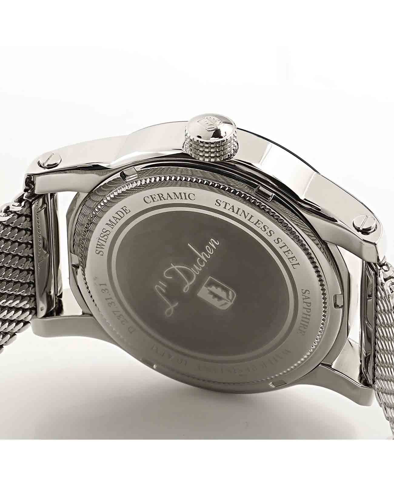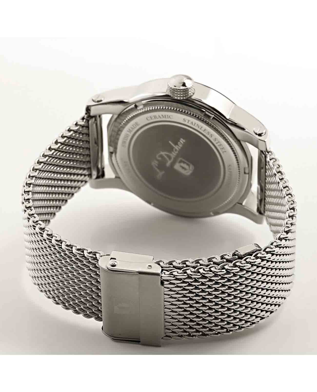 Мужские швейцарские часы L'Duchen Aerostat D237.31.31M, кварцевый механизм с высокой точностью. Сапфировое стеклоСапфировое стеклоПрочный и надёжный материал из кристалла сапфира синтетического происхождения, характеризующийся особой твёрдостью и устойчивостью к царапинам и повреждениям. устойчивое к появлению царапин, обладающее высокой прозрачностью. Корпус часов выполнен из нержавеющей стали. БезельБезельВнешний ободок, закрепляющий стекло. В спортивных часах так называется поворотное кольцо с делениями на циферблате, выполняет роль таймера – замеряет отрезки времени на шкале. Неподвижный безель – элемент декора. Однонаправленно вращающийся безель на дайверских часах позволяет фиксировать моменты погружения и выныривания на поверхность. из керамики. Стрелки с люминесцентным покрытиемЛюминесцентное покрытиеПозволяет считывать показания времени в темноте. Производители наносят на стрелки, часовые индексы, безель или поверхность циферблата светонакопительный состав, дающий холодное свечение.. Класс водозащиты: 100 метров, позволит плавать, нырять и заниматься другими водными видами спорта. Стальной браслет миланского плетения на раскладном замкеРаскладной замокДанный вариант застежки используется только на часах с металлическим браслетом. Отличительная особенность такого крепления в том, что длина браслета становится универсальной и вы можете самостоятельно отрегулировать нужный вам размер – застежка просто двигается по браслету часов..